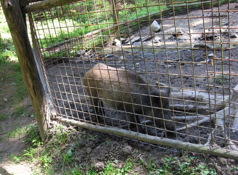 O chvíľu už na nás máva vrtuľou helikoptéra – riadny to exponát! Tešíme sa ako malé deti, lebo skanzen je ozaj výnimočný, kto tam ešte nebol, nech neváha. Len v rastúcej horúčave a s ťažkými batohmi je trochu ťažšie užiť si ho (ale prinútili sme sa). Divé svinky predsa treba ísť pozrieť! Zdajú sa mi nejaké menšie ako naposledy, možno ich vždy len vykŕmia a po sezóne sú z nich klobásy. Pretože je pekná prázdninová nedeľa, o skanzen je obrovský záujem, ale nie je tu zápcha, ľudia sa na veľkom území roztratia. Len prečo idú všetci po tom úzkom chodníku proti nám? Na vstupe do skanzenu ešte obdivujeme parný vláčik – romantika preukrutná, len neviem či sa to páči aj domácim, keď im pár krát denne dymí popred domy.