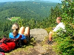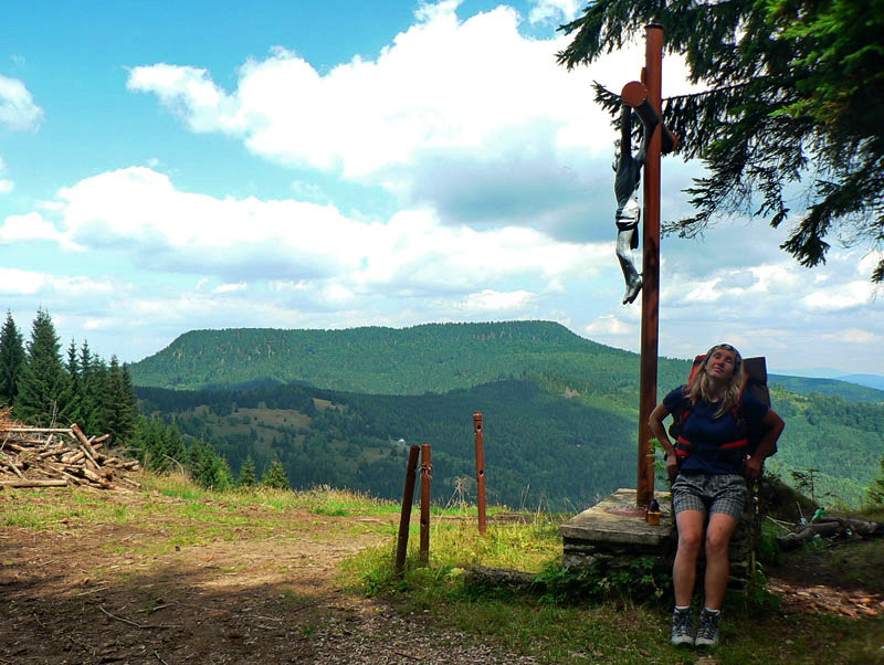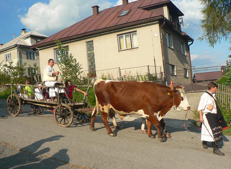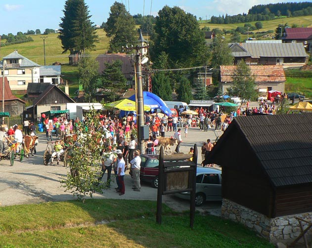 Pod krížom nemám šancu presvedčiť unavené zvyšky expedície na zachádzku po modrej kvôli vyhliadke, ani na alternatívnu trasu smerom na Uhliarku po zvážniciach a cez lazy na opačnej strane kopca, než kadiaľ vedie červená značka. Takže postupujeme cez Tri chotáre a Kysucu – Uhliarku smerom k sedlu Tlstý javor a nad osadou Sedmák obedujeme. Výhľady sú parádne, ale vietor donáša neodolateľné zvuky a vône zo slávnosti v Sihle. Dnes sú tam preteky volských záprahov a s nimi spojená prenáramná veselica! Po obede navyše zisťujeme že ja a Maťa už nemáme čo jesť a to je posledný argument – ide sa na jarmok! Veď sem pod hrebeň sa večer vrátime a stan môžeme aj tu postaviť. Je rozhodnuté. Do dediny to nie je ďaleko, kofolu už vieme kde máme hľadať a jesť treba aj zajtra.