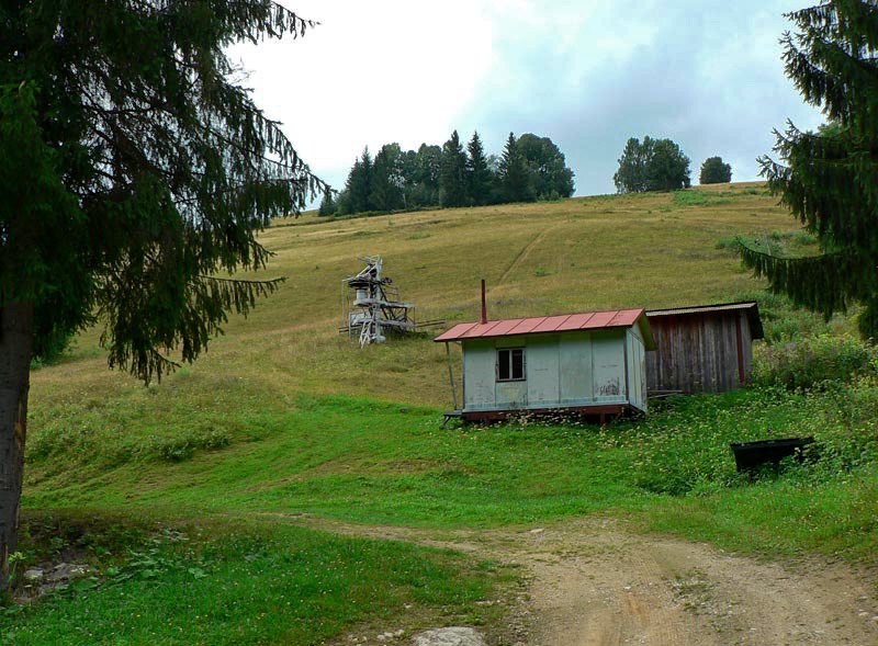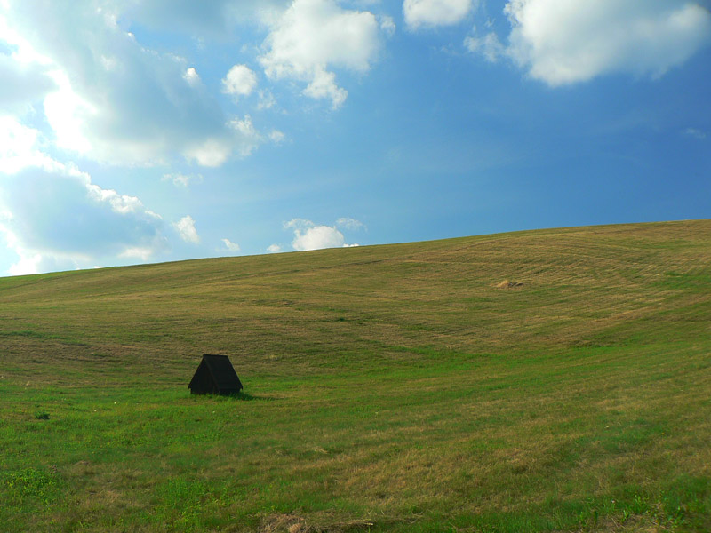 Tu sa prezúvame do tenisiek a snažíme sa nevnímať mŕtvolný puch z topánok, sušiacich sa na ruksakoch. Okolo nás rúbane, zvážnice, vrčiace aj pokazené traktory a zvuk motorových píl, len pilčíkov nevidno. Postupujeme dolu dolinou najprv po zvážnici, potom po asfalte, fotiť nie je čo. Asi po hodine odbočujeme do kopca, začíname stúpať cestou na lazy Javoriny. Pribúda sklon a teda aj pot, ale ubúda tieňa! Čím sú topánky suchšie, tým sme my viac mokrí. Plazíme sa popri malom lyžiarskom stredisku Skorušina – vyzerá zachovalo, akoby v zime aj fungovalo. Postupne sa po čoraz strmších cestách dostávame na lúky v hornej časti údolia. Chalúpky ako maľované, pred jednou dokonca bazén v zemi vykopaný a kameňom vyložený. A my sa kúpeme vo vlastnej šťave!