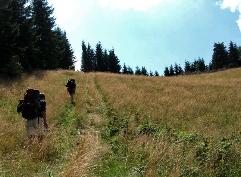 Kukáme z okienka drevenice – útulne pod Klenovským Veprom. Po predchádzajúcich dvoch nociach na tvrdom podklade sú staré matrace nevídaný komfort, ani myši v noci veľmi nešuchotali. Ráno ako vymaľované – konečne! Tie sivé špongie z oblohy odtiahli niekam na Ukrajinu, zato naše topánky sú po včerajšom blúdení a daždi stále napité vodou. Večerné opekanie im veľmi nepomohlo, iba čo moje na niekoľkých miestach prihoreli. Musíme preto zaimprovizovať tak, aby naše nohy ostali v suchu aj v teniskách, kým sa tie „akože vibramy“ budú sušiť na ruksakoch. Nazad na Vepor cez mokrú malinovú húštinu sa nám samozrejme nechce, ďalej po červenej na sedlo Zbojská to vyzerá podobne, zelená smer Klenovec tiež nenadchýňa. Volíme poslednú možnosť – po žltej nazad na Tri chotáre, potom kúsok proti smeru včerajšieho pochodu na Kysucu – Uhliarku a hádam si vychutnáme lúky nad Sihlou a možno aj tie pod Obrubovancom – tam by mal byť opustený salaš.