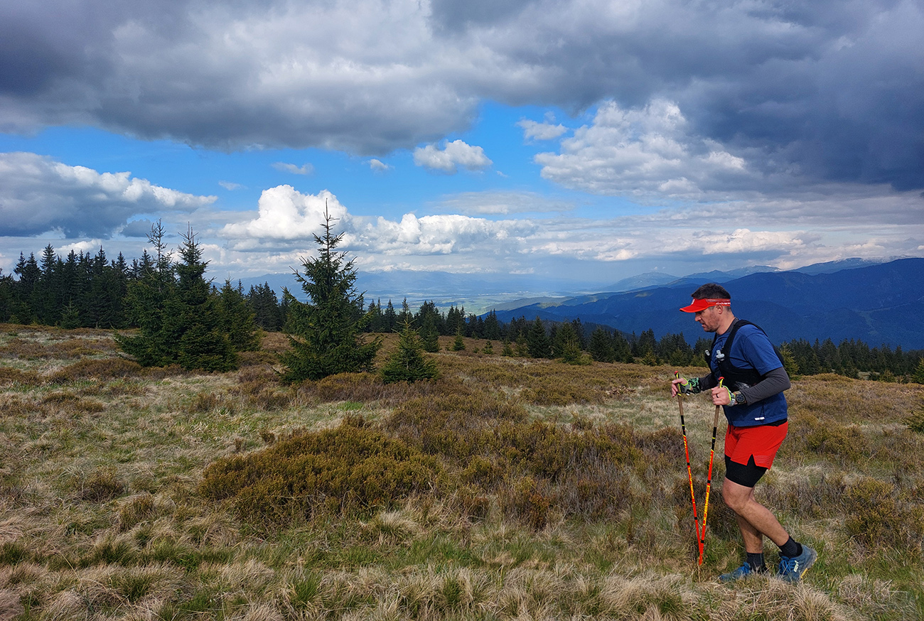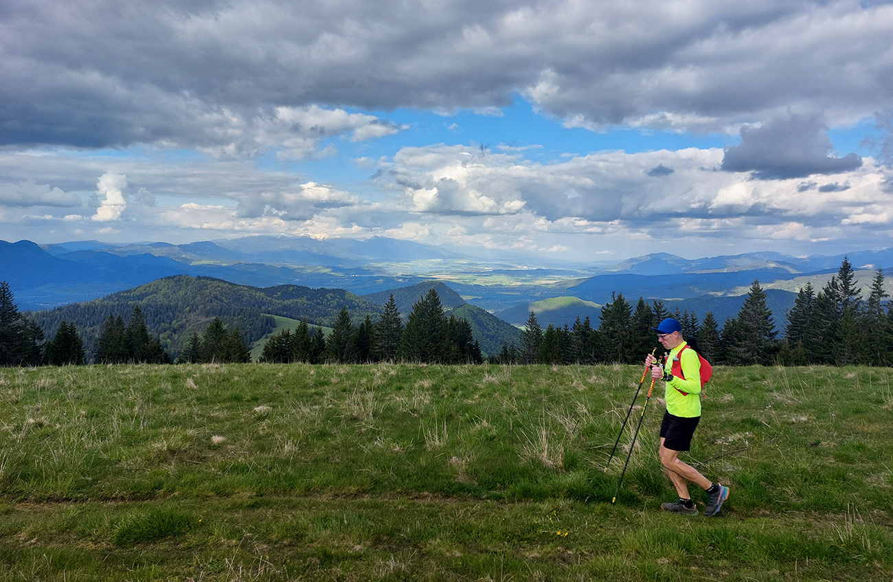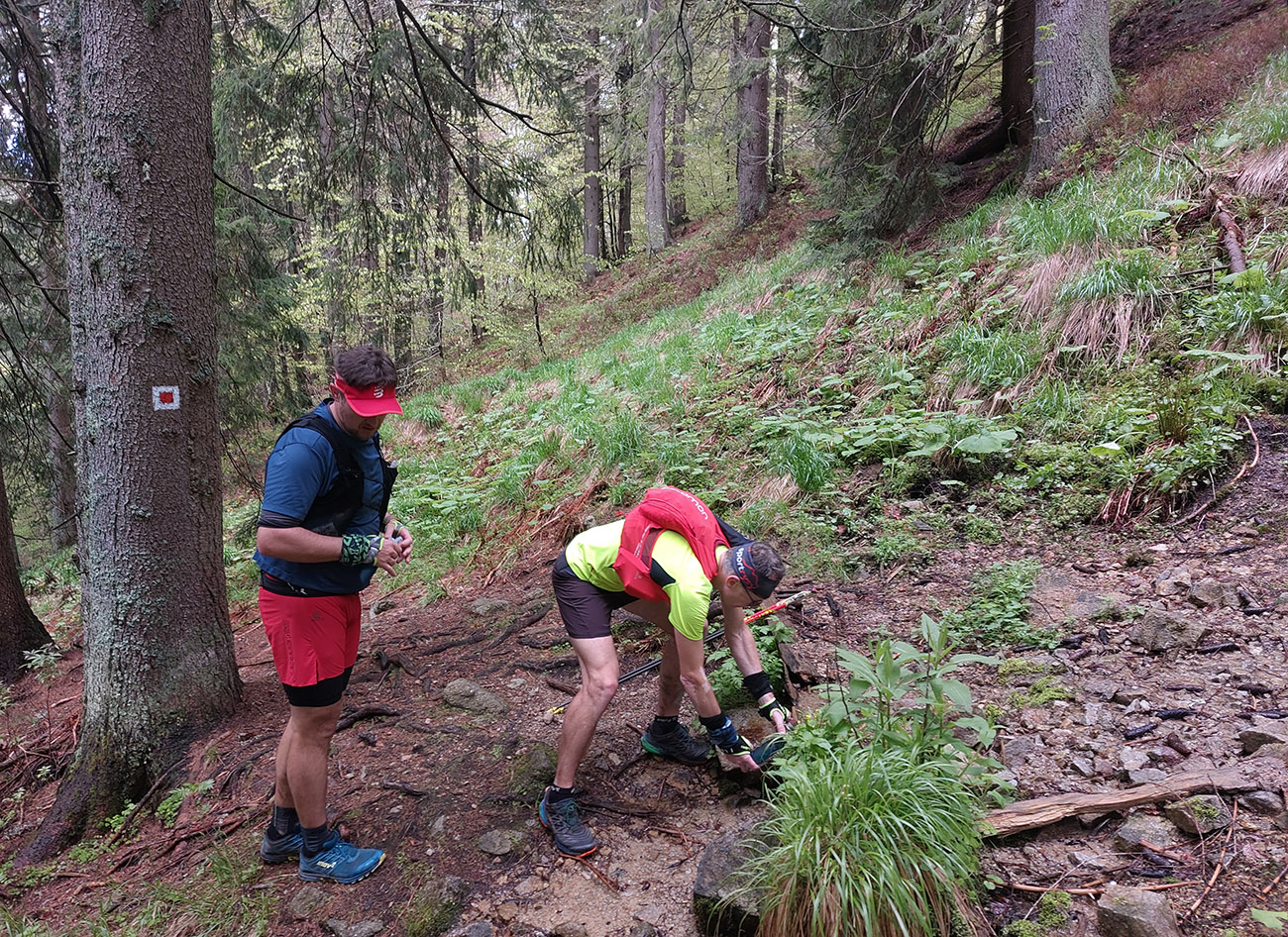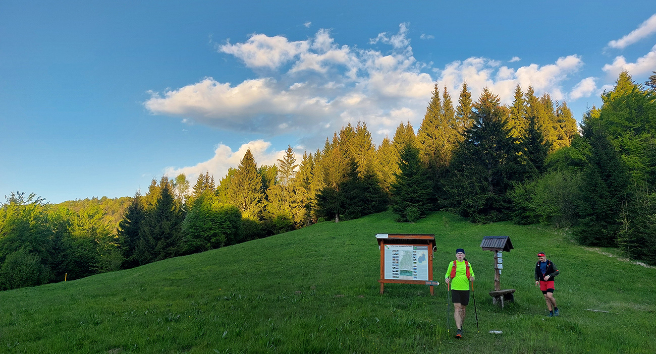 Hore slniečko, fajnúčko, pauzička - na rožky a tyčinku. Ale pohľad na hodinky nepekný: prvých 17 kilákov za štyri hodiny! Neznalý by už panikáril, my domáci vieme, že po obrátke sa to zlepší. Len či potom ešte budú sily, že? Musia byť, čelovky nemáme.
