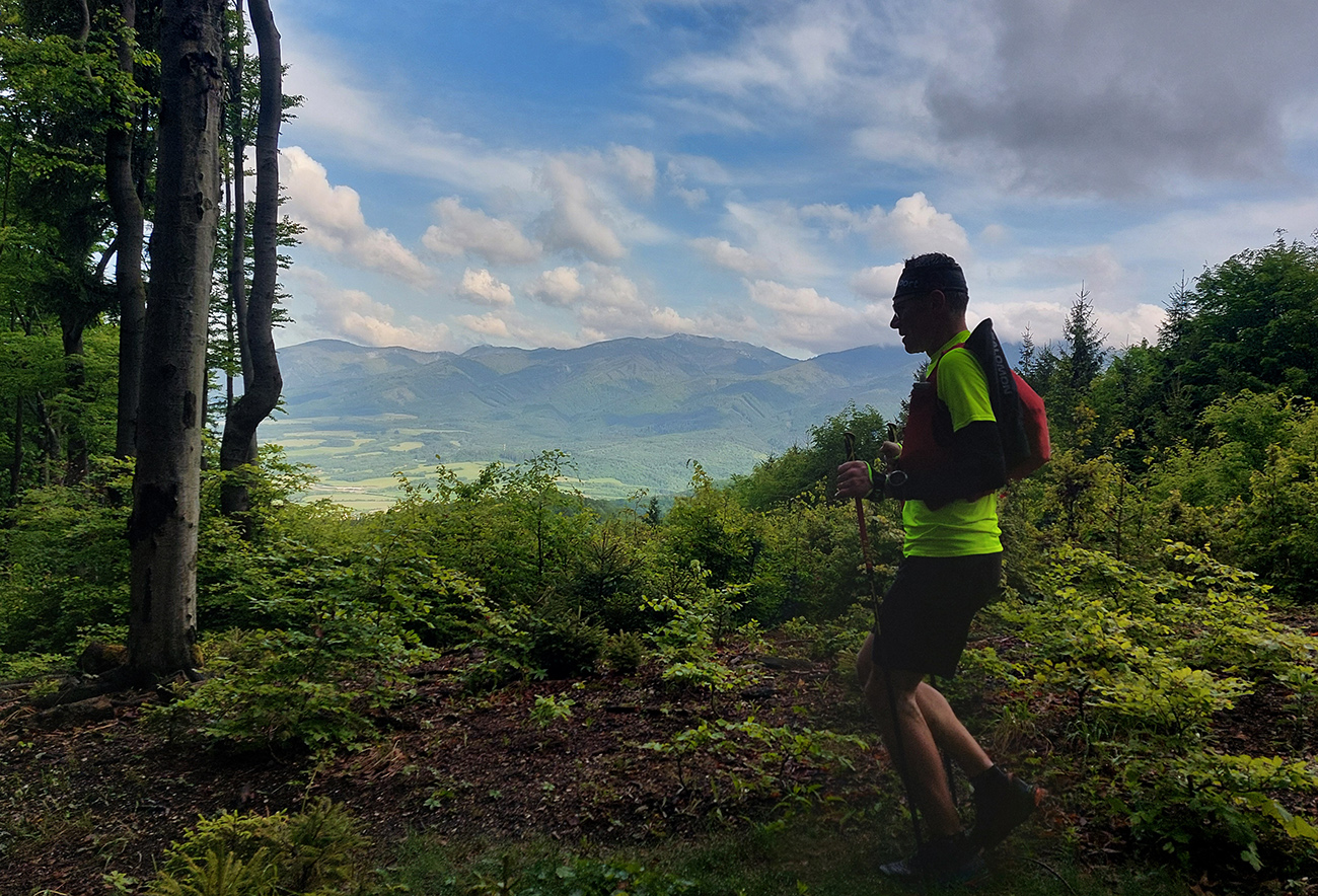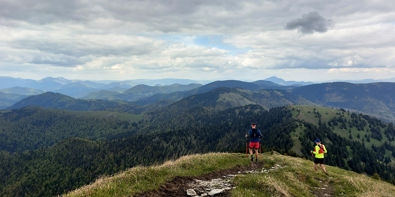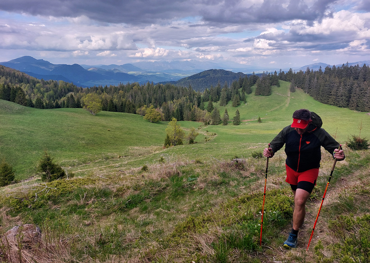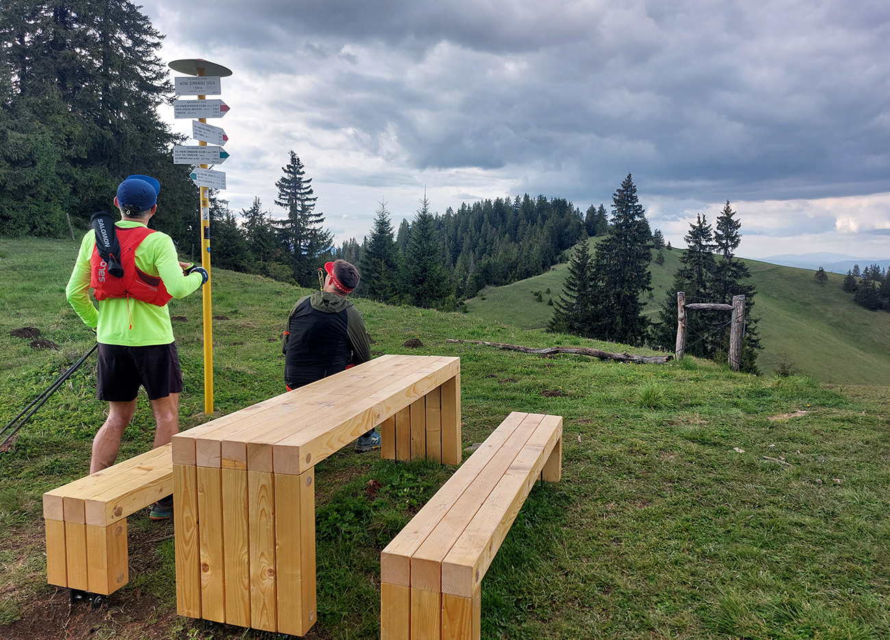 Hore slniečko, fajnúčko, pauzička - na rožky a tyčinku. Ale pohľad na hodinky nepekný: prvých 17 kilákov za štyri hodiny! Neznalý by už panikáril, my domáci vieme, že po obrátke sa to zlepší. Len či potom ešte budú sily, že? Musia byť, čelovky nemáme.