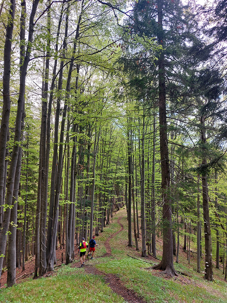 Zostup rovnal sa nástup do ďalšieho pohodového, a najmä príjemne dlhého úseku, kde kiláčiky rýchlo ubiehali a telá nedostávali moc zabrať. Len s pár menšími brdkami na spestrenie: popod Skalnú Alpu a cez Jánošíkovu kolkáreň. Takí rozbehnutí sme ani nerozmýšľali druhý raz zakrčmiť v Granite na Smrekovici (len sme posledný raz dobrali vodu vo vynovenej studničke) a rýchlo sme sa prehupli aj popod Šiprúň. Slnko už klesalo a farby začínali byť ostrejšie.