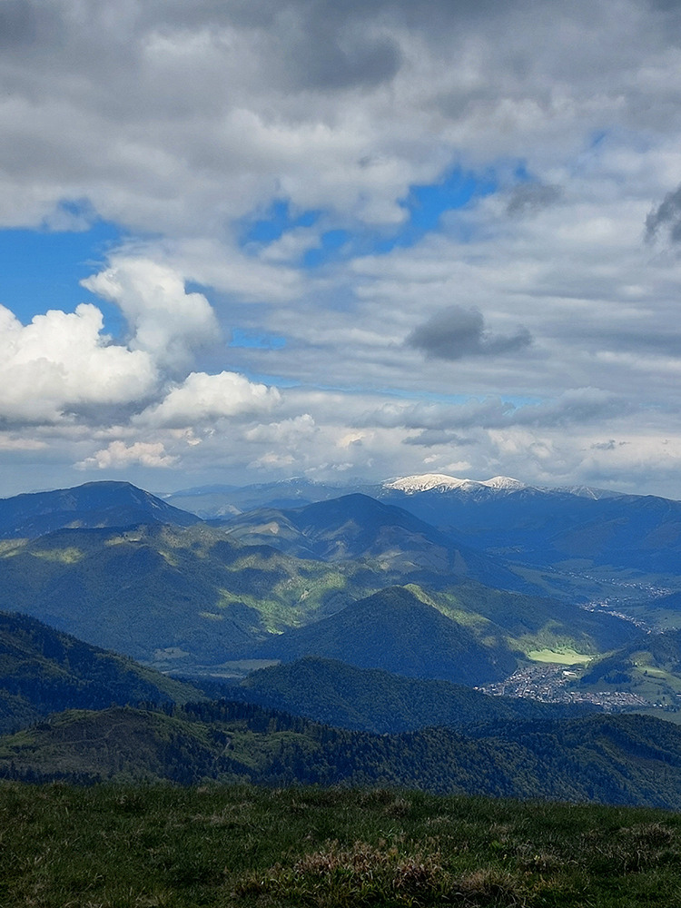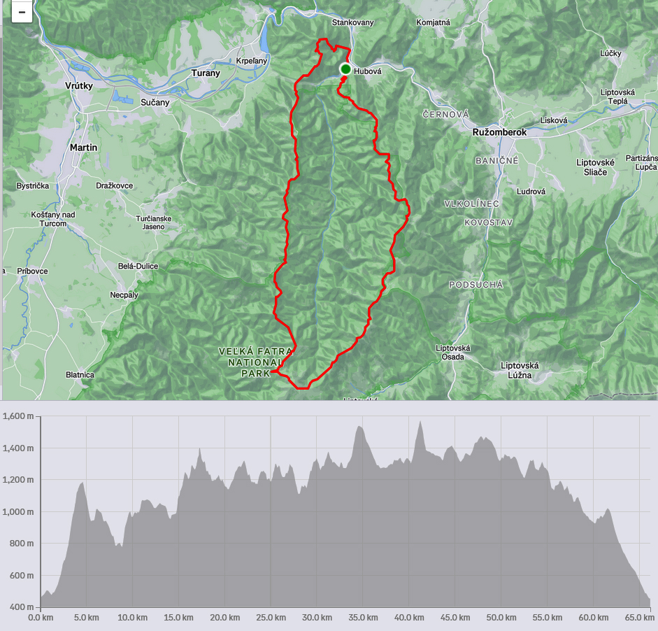 Pekne po vlastných, po veľkofatranských hrebeňoch, obkolesujúcich najdlhšiu slovenskú dolinu – tento nápad som nosil v hlave dlho, ale furt nebol čas alebo príležitosť. Lebo parametre tejto „prechádzky“ (65 km / 4500 v. m.) našepkávajú, že sa na ňu nedá len tak vybehnúť z domu. Teraz koncom mája ale všetko klaplo a dokonca sme sa nazbierali tri kusy. A aj keď pôvodný zámer bol ísť elegantne od vlaku ku vlaku v Ľubochni, ten kus, čo býva najďalej a aj ďaleko od stanice, pozbieral zvyšné dva kusy cestou do auta a bolo to komfortnejšie. Takže sme zaparkovali pred šiestou rannou pri kúpeľnom parku a keď sa šofér ešte dodatočne rozklusal asi 500 m (v aute zabudnutý telefón), začali sme plniť plán: Kopa – Kľak – Chata pod Borišovom – Ploská – Rakytov – zotavovňa Smrekovica – Magura – Kútnikov kopec. Výživnučké, často nebehateľné nie len vďaka sklonu, ale aj prekážkam. Zato však krásne, typické fatranské medveďovo, najmä na začiatku a na konci. A počasie ideálne, po fronte chladno, poloslnečno, s jemným severáčikom, ktorý neotravoval, dokonca ani na Ploskej. A to už je čo povedať! Takže takto to vyzeralo, gpx je hore: