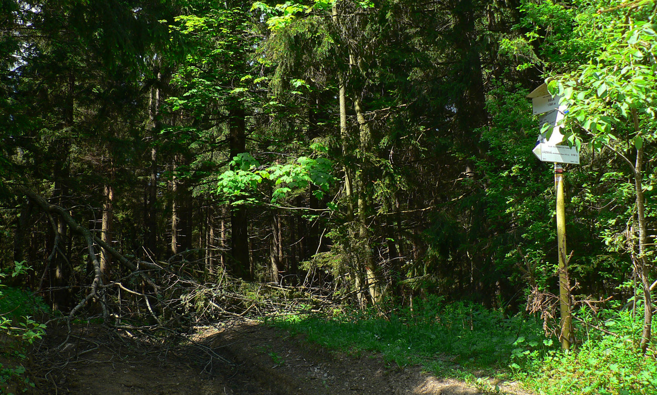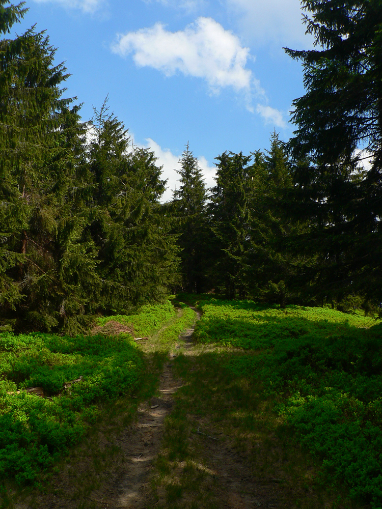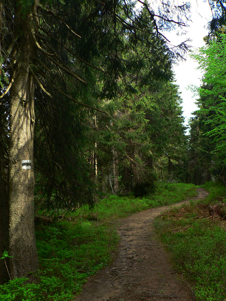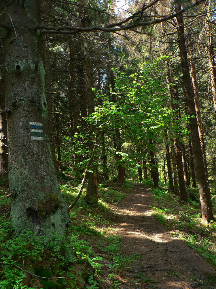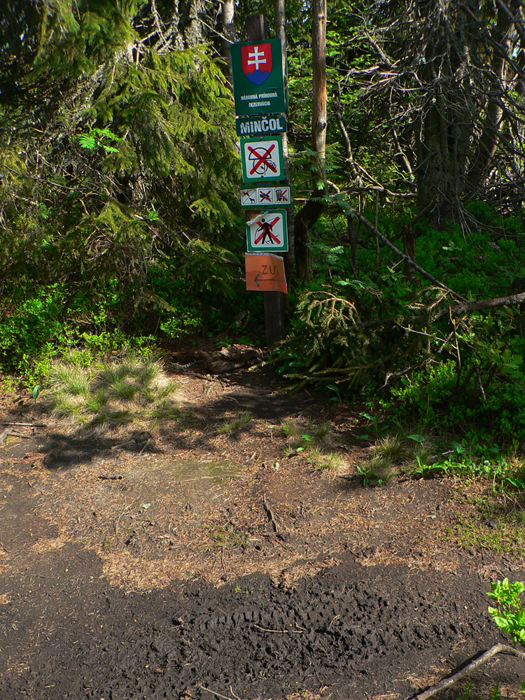 Na začiatok teda červená na Minčol: strmo hore po asfalte, ktorý postupne prejde do šotoliny a trávy. Po vstupe do lesa pri Hlásnej skalke klasický traktorový mordor. Ale ten netrvá dlho, vyššie je suchšie a cesta sa zúži na chodník. Na temene Minčola už kľučkuje čučoriedkovou smrečinou. Výhľady spočiatku na Zázrivú, Pupov vrch, Rozsutce, ale furt dozadu, treba sa za nimi obzerať. Len na chvíľu sa vpredu vztýči Minčol (na vyhliadkovom pasienku sa dá aj fajnej vody nabrať) a potom už ponor do lesa.