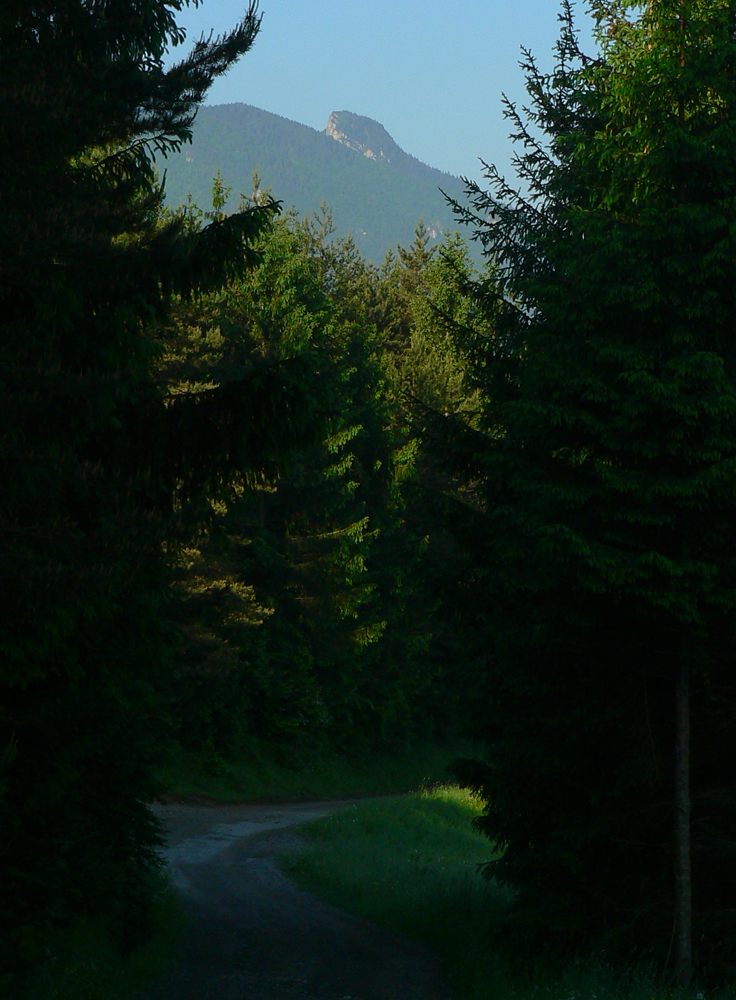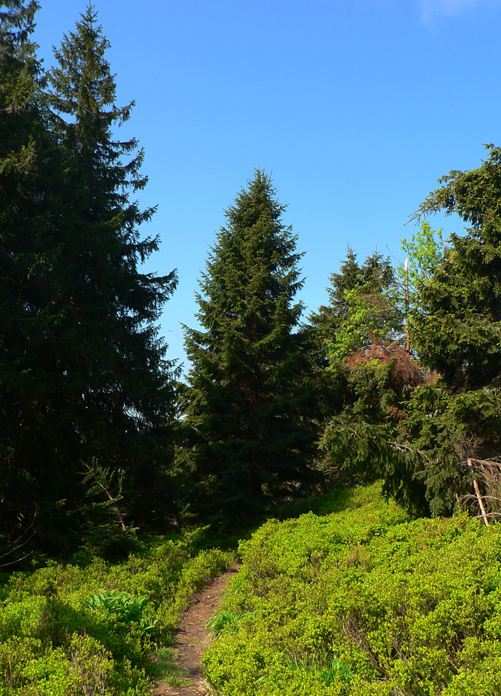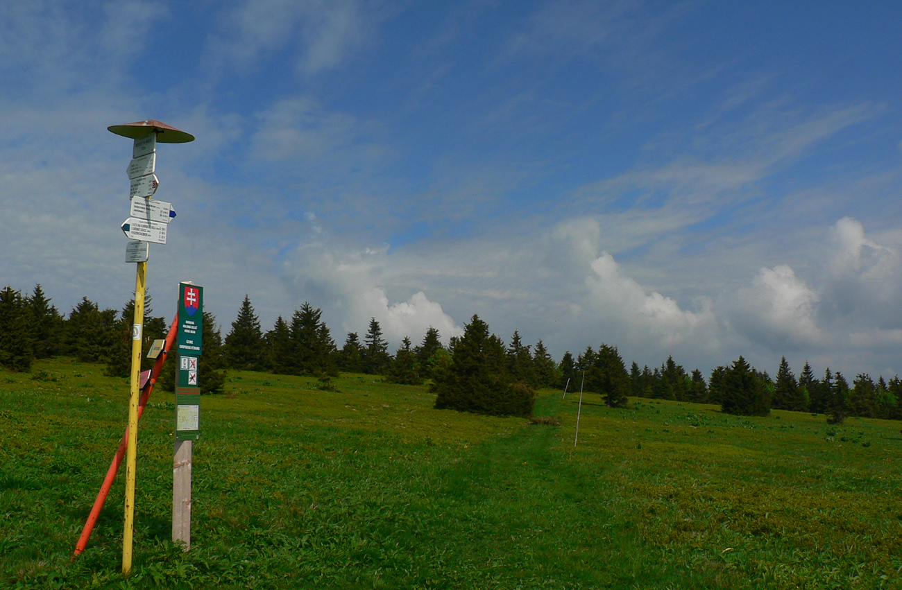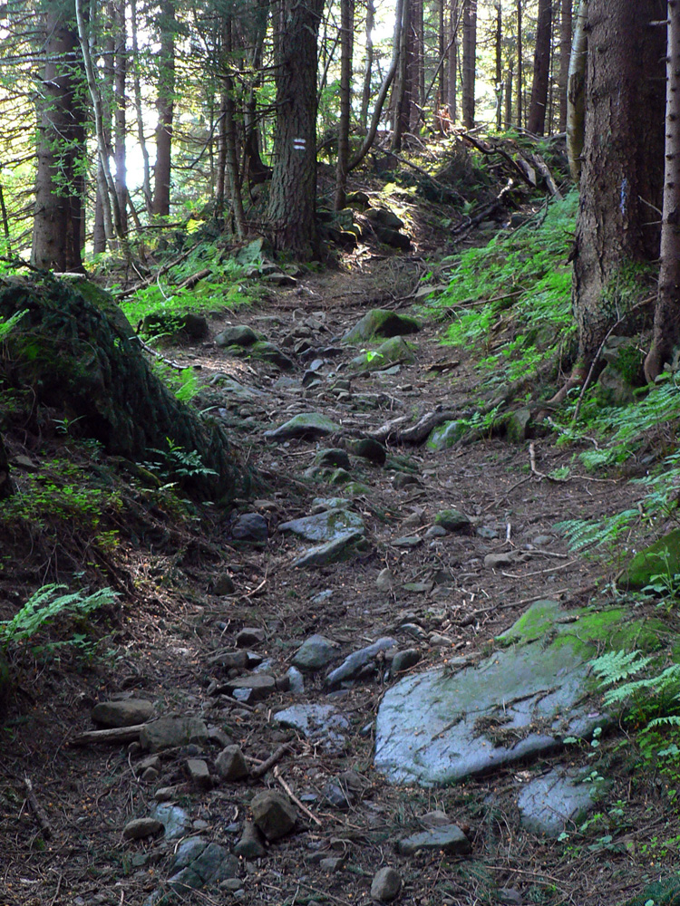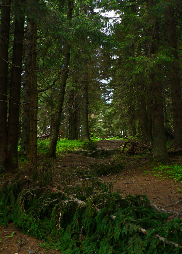 Na začiatok teda červená na Minčol: strmo hore po asfalte, ktorý postupne prejde do šotoliny a trávy. Po vstupe do lesa pri Hlásnej skalke klasický traktorový mordor. Ale ten netrvá dlho, vyššie je suchšie a cesta sa zúži na chodník. Na temene Minčola už kľučkuje čučoriedkovou smrečinou. Výhľady spočiatku na Zázrivú, Pupov vrch, Rozsutce, ale furt dozadu, treba sa za nimi obzerať. Len na chvíľu sa vpredu vztýči Minčol (na vyhliadkovom pasienku sa dá aj fajnej vody nabrať) a potom už ponor do lesa.