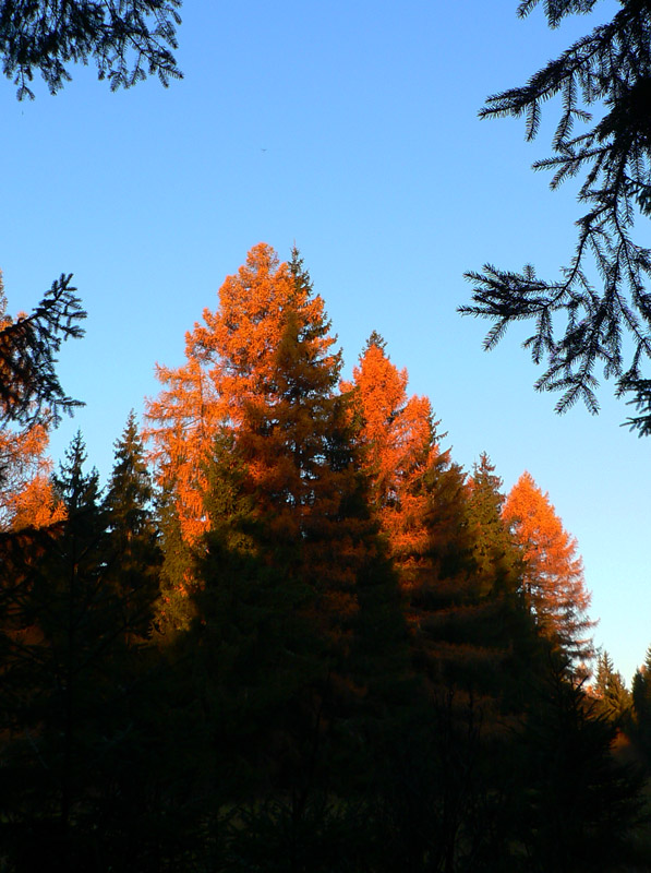 Nejako často som sa zastavoval kvôli foteniu či čo, čas ma začína tlačiť dolu kopcom čoraz rýchlejšie. Pred vstupom do lesa ešte s údivom registrujem v rovnomerne zalesnenom svahu Račkovej doliny vyhryznutý hnusne veľký obdĺžnik, totálne pravidelný, od dna doliny až po hornú hranicu lesa – ten lykožrút je teda riadne svinstvo :-) Ale to sa mi už foťák vyťahovať nechce, serpentíny radšej beriem poklusom. Na ďalší „kontrolný bod“ na Nižnej lúke prichádzam síce tesne po limite, ale dá sa. Presun ku skanzenu je síce znova zrýchlený, ale nájde sa ešte čas obzrieť sa a vychutnať si dnešné kopčeky v podvečernej červeni.