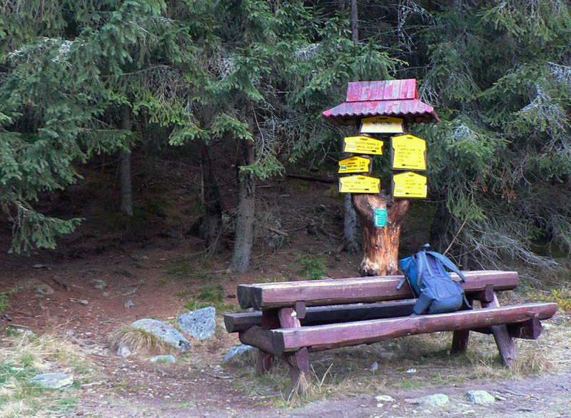 Lavička a smerovník na Nižnej lúke – tu to začína. Poriadne strmé stúpanie lesom, podobné napríklad nástupu na Baranec. Vrývam si do pamäte hodinu, kedy sa sem musím vrátiť, aby som stihol (zase s forsážou) autobus. Malo by to vydať až na Hrubý vrch a späť. Takže nasadzujem pohodové tempo, iné sa na tejto streche ani nedá. Chodník sa vrtí serpentínami (už prečistený od kalamity), najprv na hranici lesa a rúbane, o chvíľu len v lese. Výhľady leda pod nohy, ale je tichúčko a čoraz teplejšie. Som zvedavý, kde pocítim ten meteorológmi sľubovaný víchor.