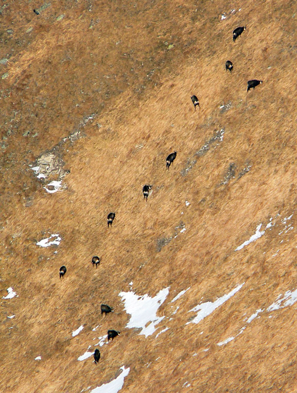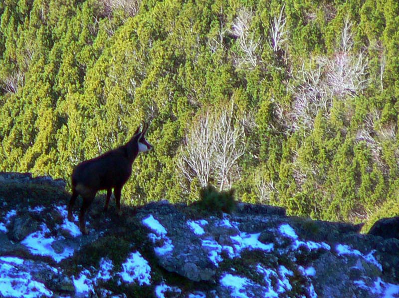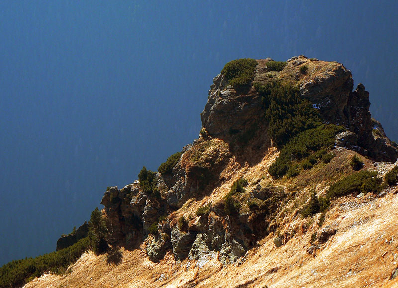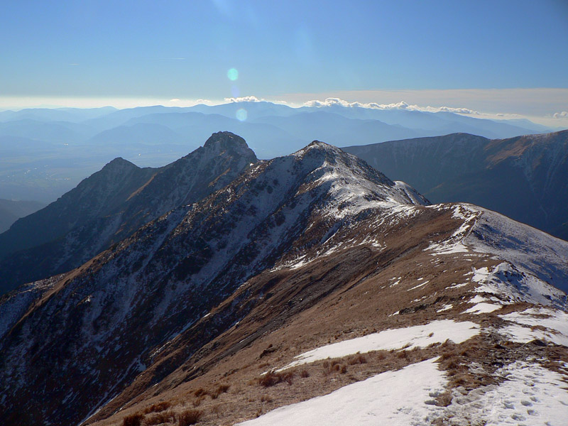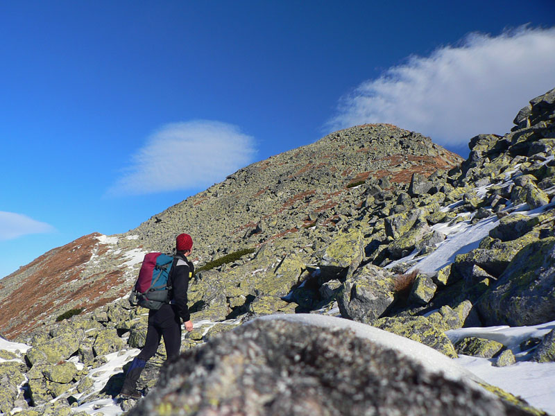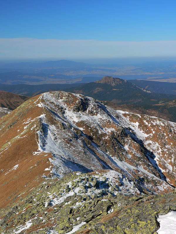 Po ďalšej hodine sa začínam vynárať z lesa a konečne začína to, kvôli čomu som sem prišiel. Nekonečné výhľady, fotogenická krajina, ostré farby. Tento bočný hrebeň je na rozdiel od svojich susedov nad lesom dosť zubatý, žiadne monotónne stúpanie. Niekedy treba aj klesnúť pár metrov, pomotať sa po skalách, pomedzi kosovku či po suťovisku, sem tam si pomôcť rukami, je to pestré. Na pravoboku dno Račkovej je ešte v tieni, Klin ale už svieti celý, podobne roháčsky hrebeň vľavo vpredu. So slnkom za chrbtom sa príjemne stúpa a aj keď predpovedaný vietor dáva o sebe vedieť, nie je nepríjemný, osviežuje. Nikde ani človeka, len kamzík samotár pod Ostredkom. Ale predsa – ďaleko vpredu sa hore kopcom mrvia dve postavičky, pomaly sa k nim blížim. Teplo a pre oči príjemné okrové svetlo sála z južných svahov, pod Jakubinou sa na nich opaľuje kamzíčia rodinka. Severné svahy sú pocukrované, primrznuté, na zvyškoch udupaného snehoľadu sa miestami dosť šmýka. Bralnaté vrcholce Otrhancov je ľahké si pomýliť, nie som si istý, cez ktorý som sa práve prehupol, ale nevadí. Kontrolu času odkladám až na Hrubý vrch, podľa nej sa zariadim. Stúpanie na Jakubinú je po predchádzajúcom prepletaní sa suťoviskom už plynulé. Zdá sa to byť ďaleko, ale o chvíľu som hore, otvárajú sa zas nové pohľady do Poľska a na Oravu. Telo by aj jedlo, ale tu už riadne duje, preto radšej šliapem ďalej na „časovú kontrolu“. Symbolicky „na skok“ do Poľska, otočka okolo hraničného kameňa. Smerovník je pod vrcholom na križovatke s červenou, v závetrí. Obzerám sa po hrebeni, napriek pokročilej dobe sa všade motá množstvo ľudí. Niektorí takými smermi a takým tempom, že nemajú podľa mňa šancu dostať sa do tmy do doliny. Na najbližšej skupinke vidieť na veľkých batohoch karimatky, je to jasné. Veď zajtra je tiež voľno, čo tam po návštevnom poriadku...