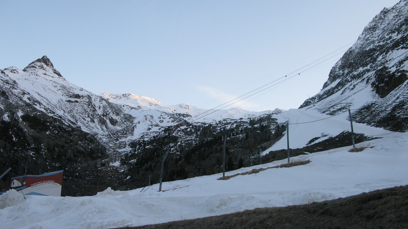 Z dvoch variánt v smere od Kurzrasu (Schnallstal) sme zvolili tú orientačne jednoduchšiu, ale zase ťažšiu, čo sa prevýšenia týka. Aj vzhľadom na vysoké denné teploty sme ráno o 6:20 hod. vyrazili z parkoviska (2000m.) hore po zjazdovke smer horná stanica Teufelsegliftu (3034m).