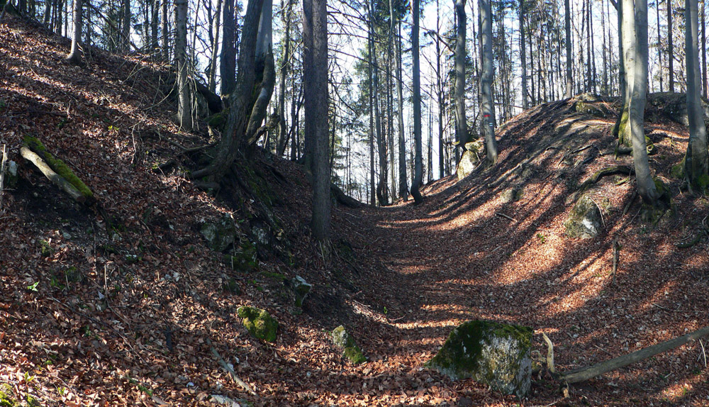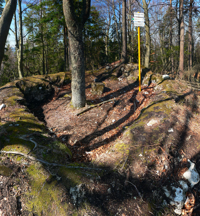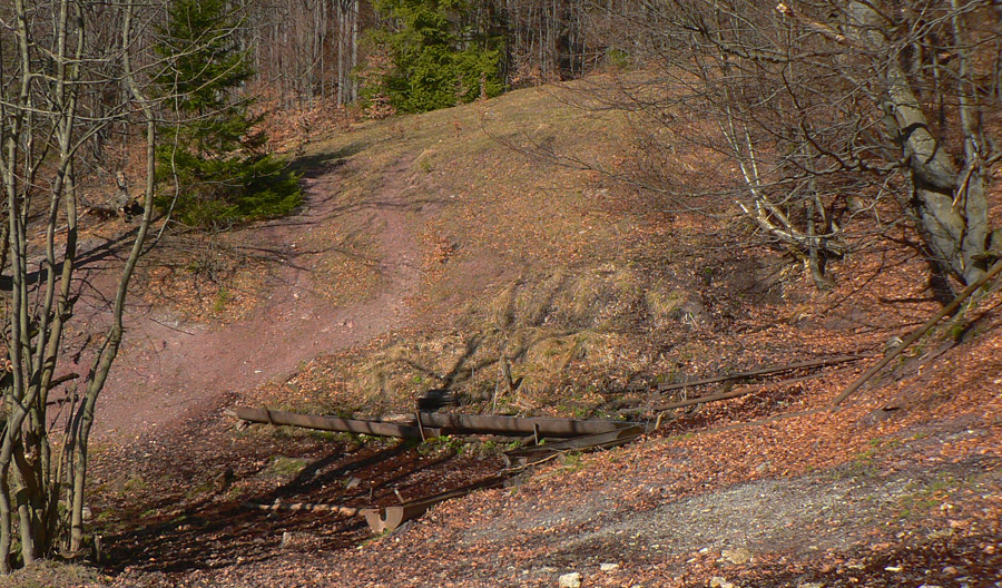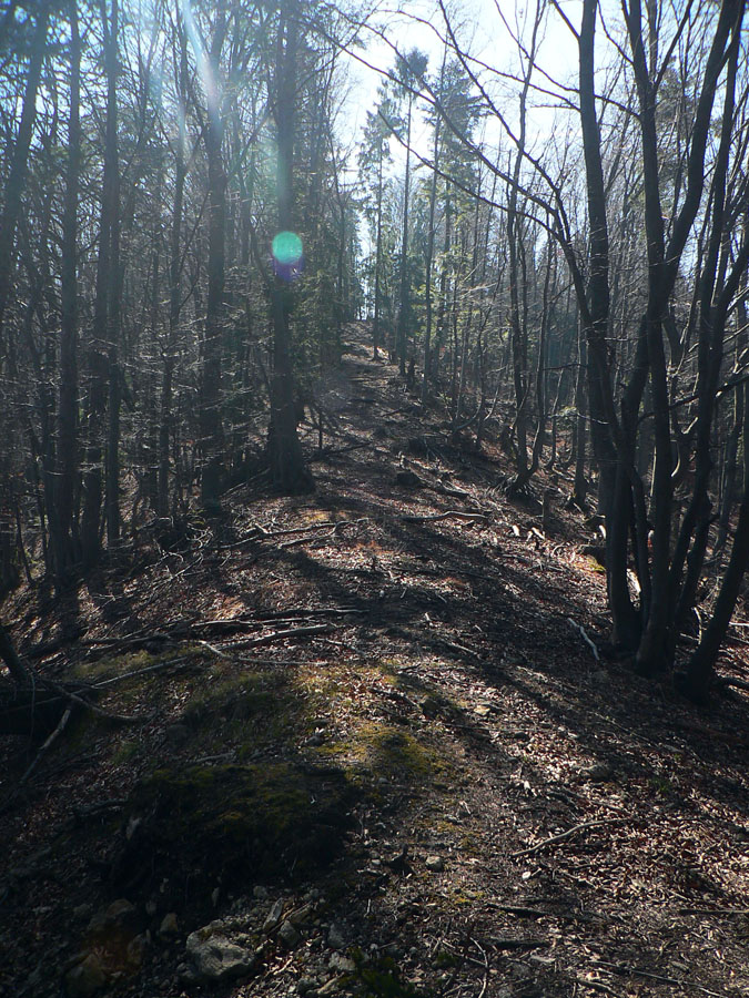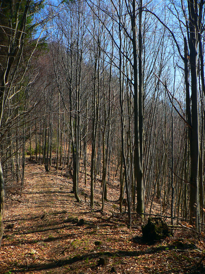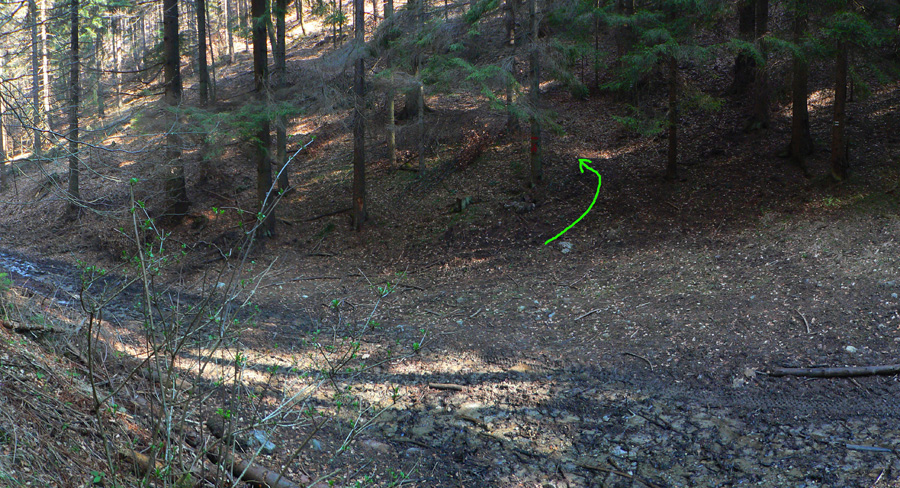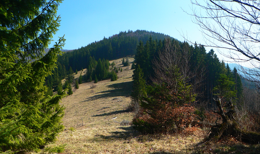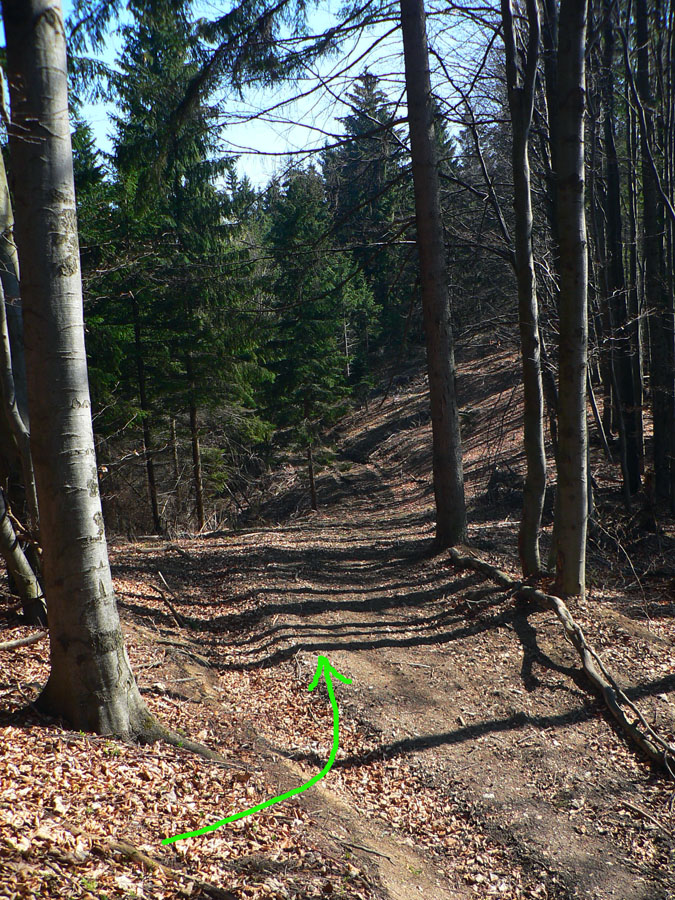 Na konci série rúbanísk vedie krížom cez náš hrebeň chodník - stúpa sem sprava zo záveru Hradskej doliny a klesá doľava na lúky nad Hlavnou dolinou. Za touto „križovatkou“ nasleduje široký priesek lesom a hrebeň sa pomaly odkláňa na východ, doľava od Prieložnice (1079m), ktorá bola doteraz priamo vpredu. Na konci prieseku v malom sedielku sa treba prebojovať cez popílené konáre, ale na severnom svahu hneď pod hrebeňom je zvážnica. Vedie správnym smerom, ale dá sa aj ponad ňu lesom. O chvíľu vylezie do sedielka s drevoskladom, z neho sa odkloní doprava do traverzu (klesá do Kantora), ale náš hrebienok pokračuje priamo, zase výrazným priesekom.