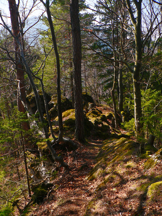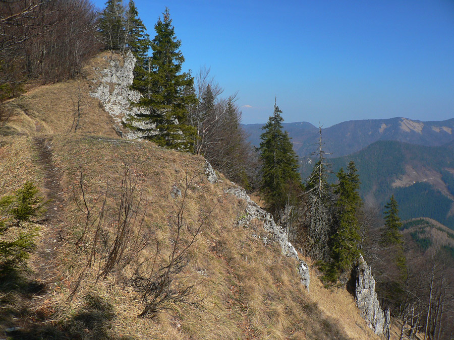 Hrebienok je najprv úzky, krásne bralnatý, chodník sa kľukatí pomedzi skaly. Dominujú borovice a sem-tam sa objavia výhľady na východ. Keď sa terén zaguľatí, hneď je tu sprava rúbanisko až dole po cestu v Hradskej doline, ale aj spätný pohľad na Krivánsku Fatru a na kopec s hradom. A všade bordel po pilčíkoch - prasce sú to, čo už s nimi?
