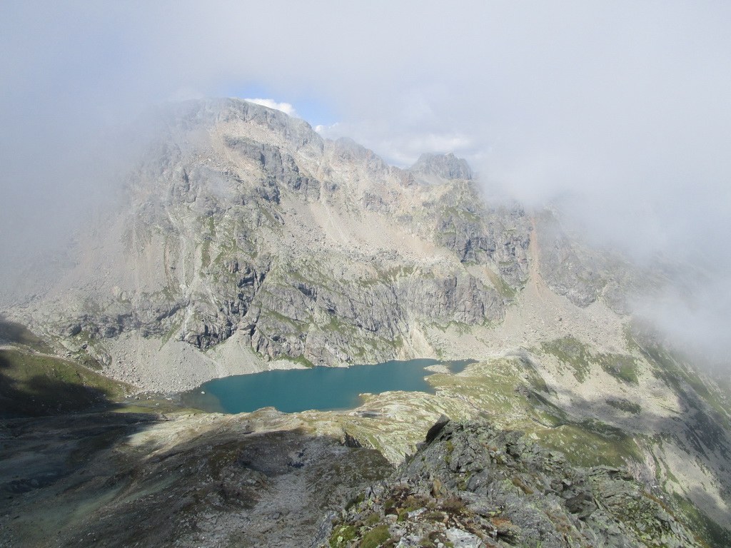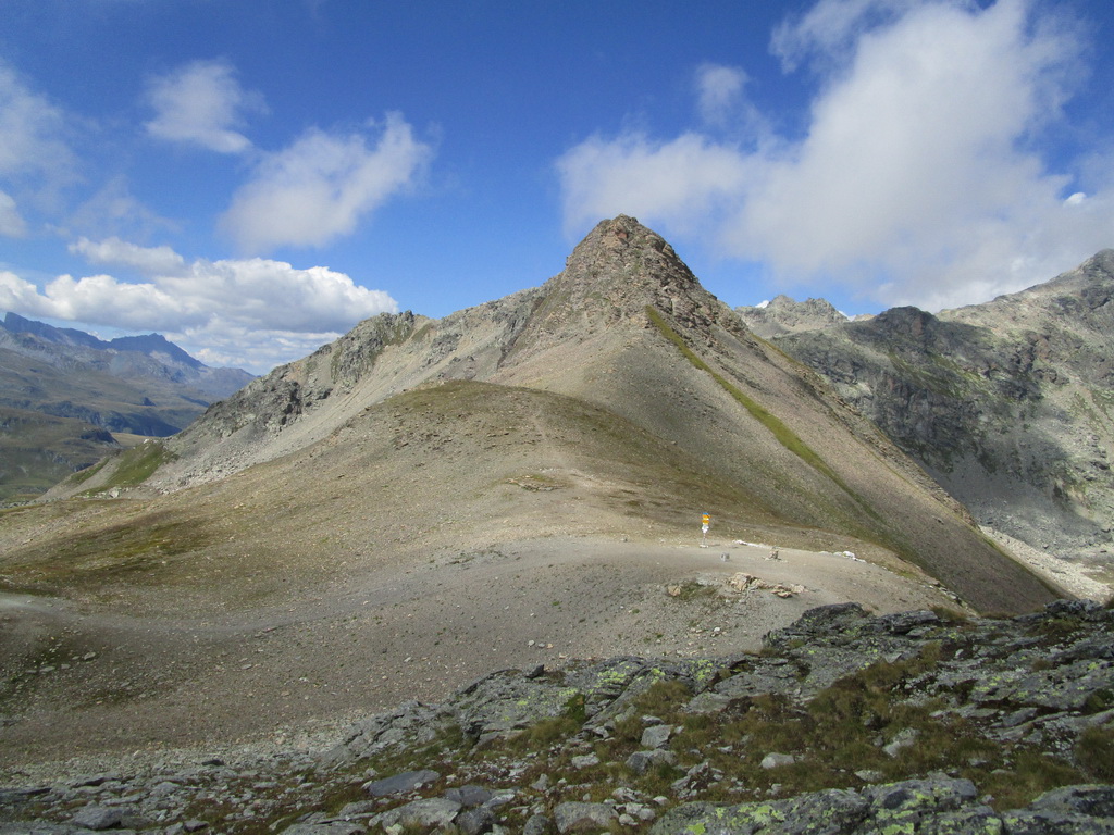 Po návrate na parkovisko si doplním z auta nejaké zásoby a po krátkej pauze vyrážam na opačnú stranu. Pekne po červenej značke rovno hore. Prechádzam okolo krásneho jazera s rovnakým názvom. Kochám sa výhľadmi na Piz Grevasalvas a namierim si to do pass Lunghin. Modrá značka začína až odtiaľto.