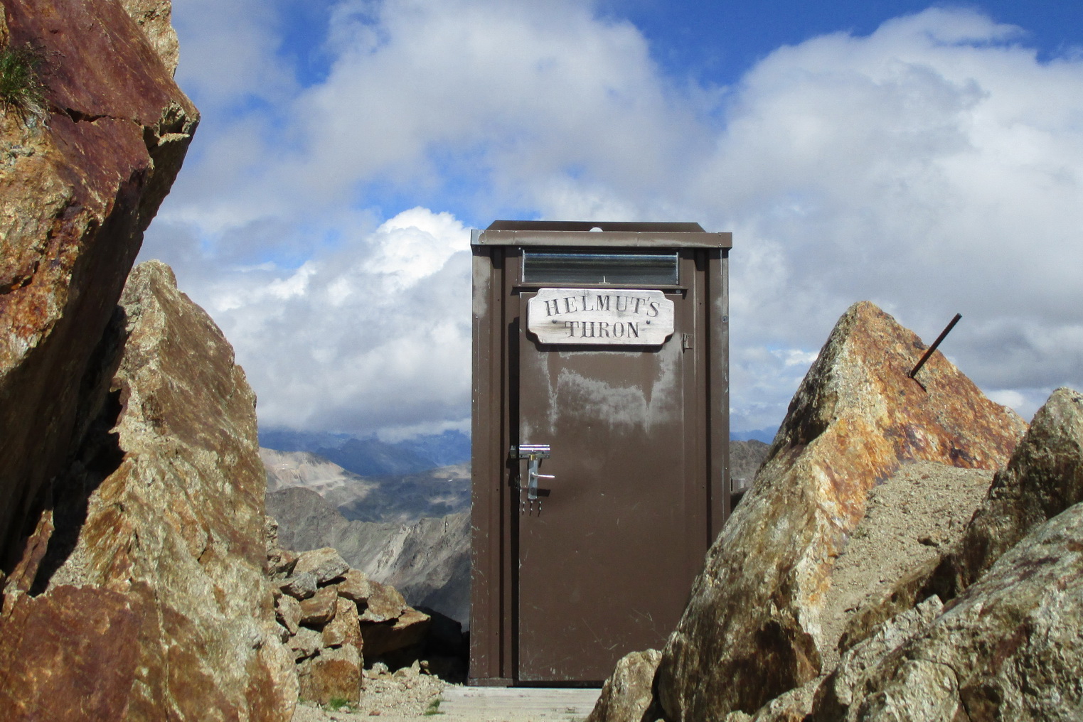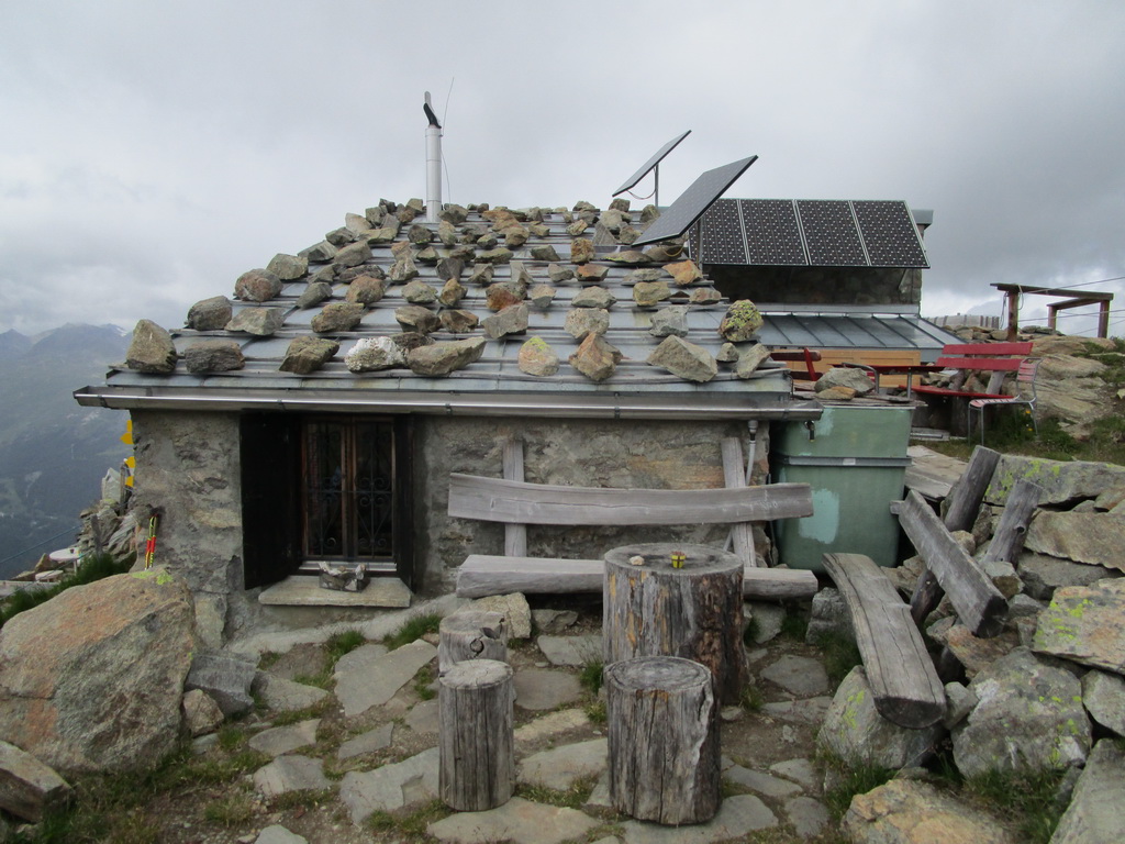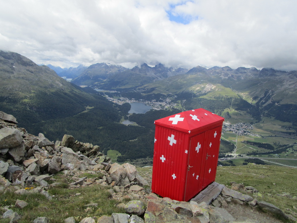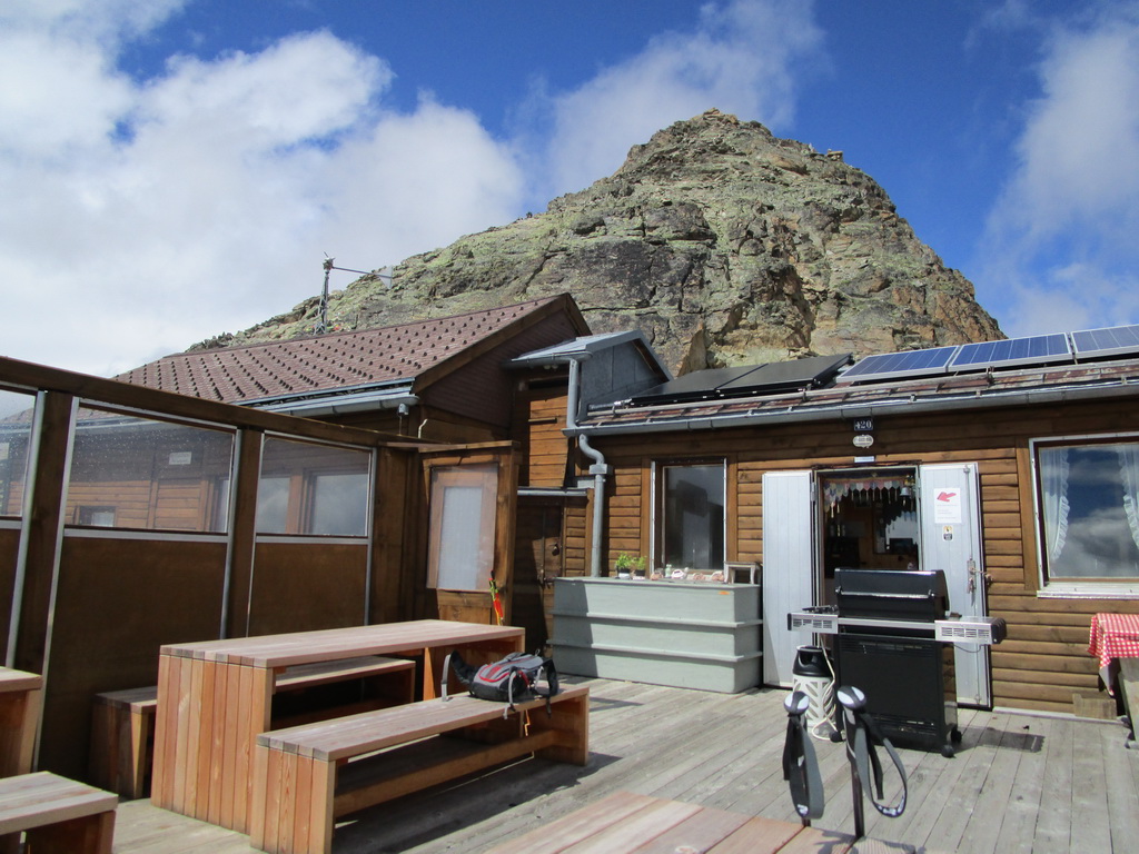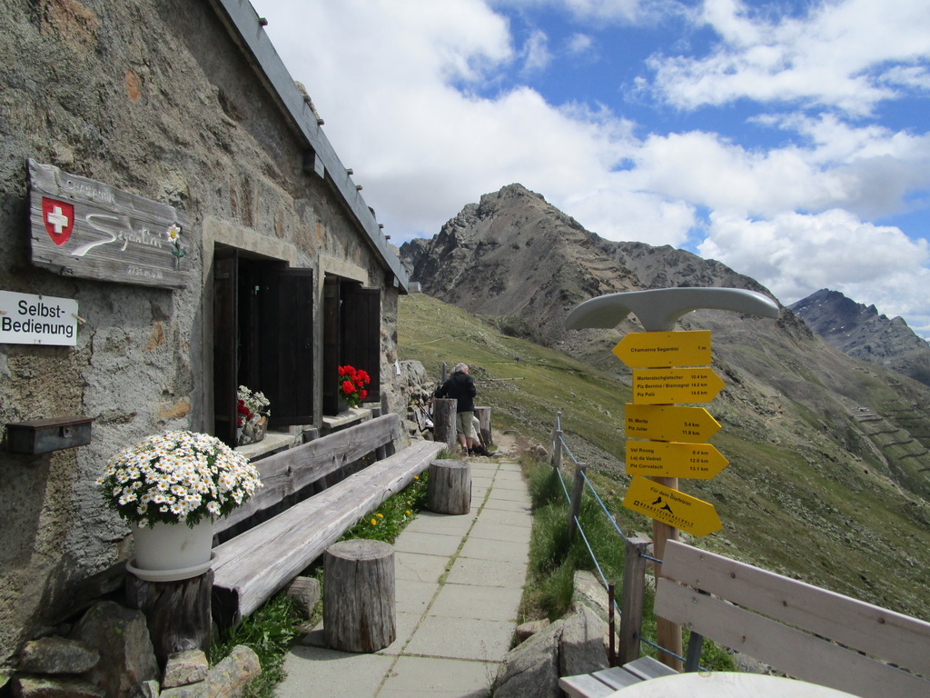 Priamo pod vrcholom je chata Georgy s parádnou terasou s nádhernými výhľadmi na masív Berniny. Dalo by sa tu vysedávať a pozorovať výhľady donekonečna...