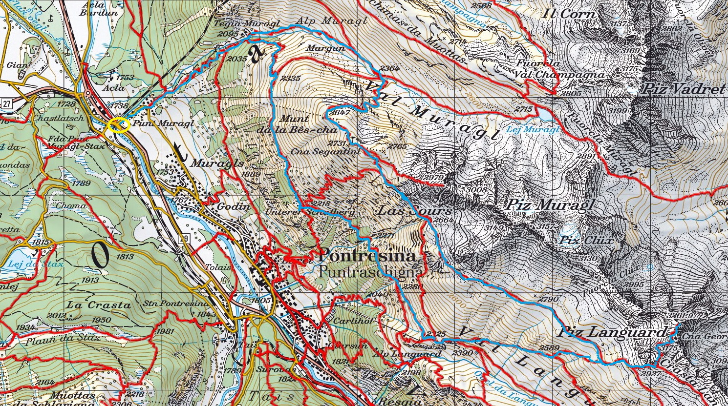 Nad turistickým strediskom neďaleko St.Moritzu - Pontresinou sa nachádza turistický raj s nekonečným množstvom značkovaných chodníkov a chodníčkov. Nájde si tu skutočne každý a tí so slabšou kondičkou alebo s viac rôčkami na krku si radi pomôžu sedačkou vedúcou priamo z Pontresiny alebo pozemnou lanovkou na Muottas Muragl. Práve medzi hornými stanicami týchto dopravných zariadení je niekoľko možností na parádne vyhliadkové traverzy.