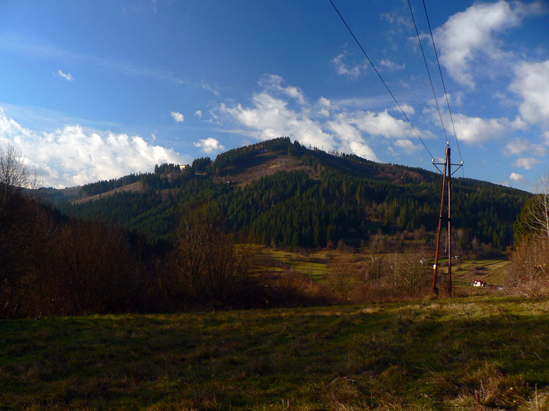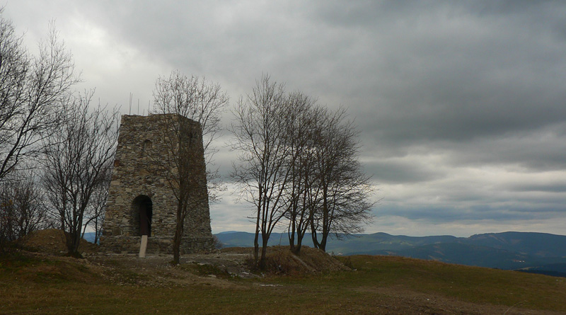 Pomaly sa motám smerom v výraznému ukazováku, ktorý sa týči v diaľke na kopci – nad osadou Macaškovci rastie nová rozhľadňa. Keď som tam bol, hotový bol len kamenný spodok (november 2010). Dnes už je komplet. Červená síce vedie nižšie, cez osadu, ale bolo by škoda nevychutnať si rozhľad. Aj poobedovať by nezaškodilo, len závetrie nie a nie nájsť na tom holom kopci. A akoby sa k dažďu schyľovalo, mrakov pribúda.