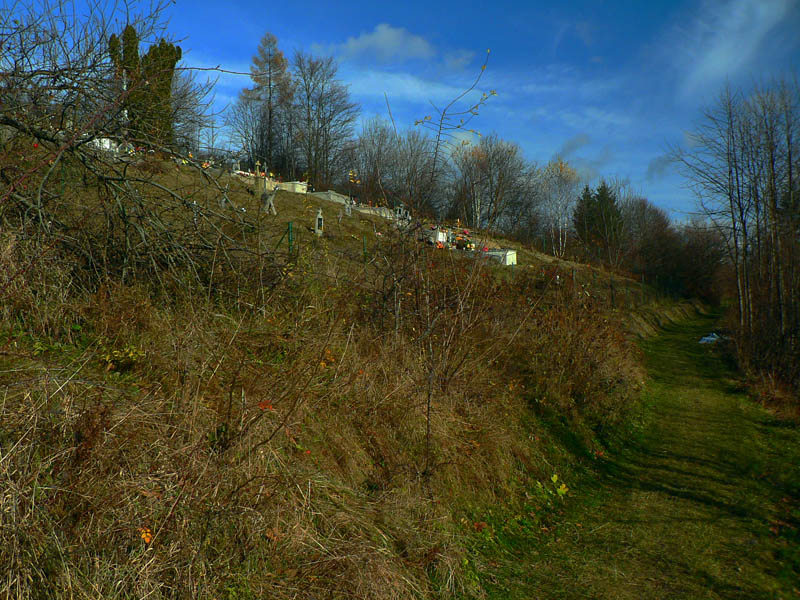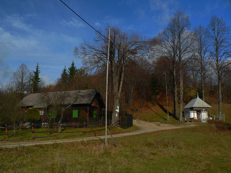 Plynulo strácam výšku po jednom z bočných hrebeňov, prechádzam okolo Kantorovcov a Kubalovcov, za rohom vykukujú Ondruškovci a všade stavebný ruch a frmol, tu to riadne žije! V sedle medzi Ochodnicou a Neslušou, pri osade Klinkovci, zaujímavá symbióza pietneho miesta a turistického smerovníka v malej ohrade. Tabuliek ako v Tatrách, kvetov ako na cintoríne :-)