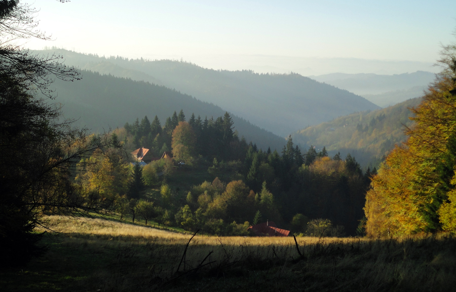Veziem sa busom cez Dlhé Pole, srdce drotárskeho kraja. Dlhé je ako slíž, len polí nikde :-) Dolina čím vyššie, tým užšia. Spoj nejde až na konečnú, ale nevadí, lebo končí jasná noc na konci októbra, v doline je kosa ako v ruskom filme, dobre padne poklusom sa zohriať ten zvyšný kilometer po les. Nasleduje pekný chodník farebným lesom hore na červenú „hrebeňovú zvážnicu“, k osade Vrchrieka. Prípory, prvá samota nad dolinou, už sa kúpu v slnku - hneď je teplejšie. Inverzia ako má byť, dnes našťastie bez hmly, bude to super. Zvedavý som len na hĺbku a kvalitu bahna – to aby hore nebolo, to by bol zázrak. Bude sranda, lebo idem „naľahko“, len v teniskách, aby som pobehol ak ma bude čas súriť. Autobus nepočká. Ale mám moje „ultratrailové psie dečky“, tie ma zachránia :-)