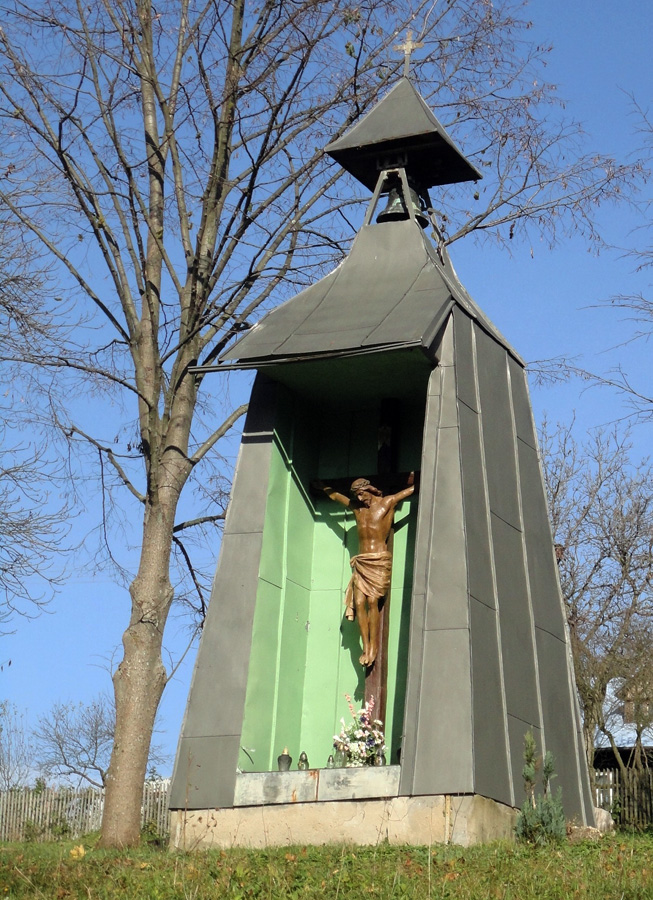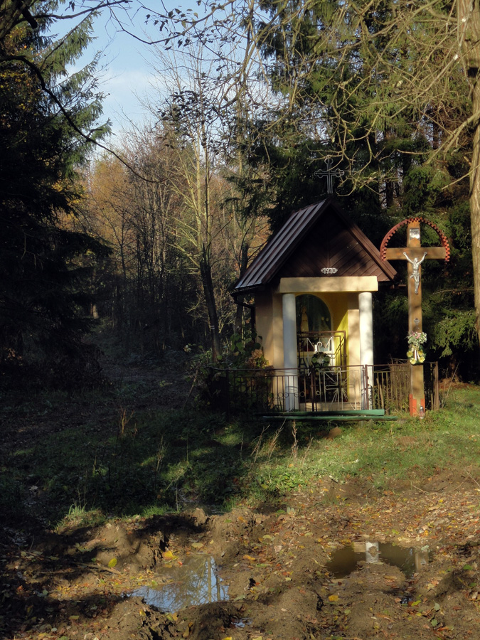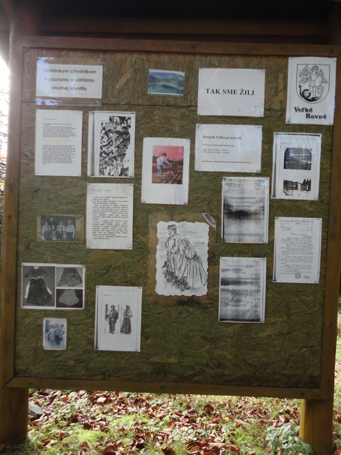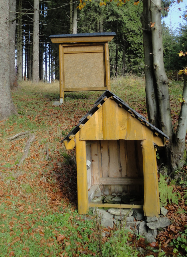 Z Vrchrieky ostáva mi ešte prejsť lesom cez kopček zvaný Luby – len monotónne hore a dolu, podľa mapy stále lesom bez výhľadov. Ale tesne za nezreteľným vrcholom je pod chodníkom na juh otočená studnička a pri nej „nástenka“ s obrázkami z obecného života. Dobre sa tam na suchom koreni sedí, miesto ako stvorené na obed. Veď aj čas už dozrel. Po obedíku som o chvíľu von z lesa.