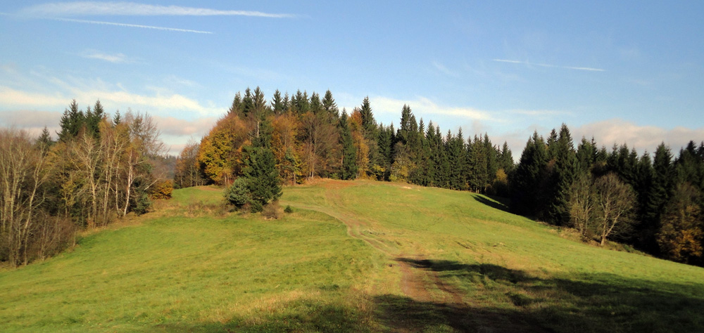 Zatiaľ smerujem do sedla (a osady) Semeteš. Som tam o chvíľu, ako sľubuje smerovník, nechávam trochu blata na asfaltke, ktorú križujem, a nasleduje najkrajší úsek dnešnej cesty (a po suchom!) do osady Vrchrieka. Nejaké obľúbené miestne meno - táto Vrchrieka je na červenej značke v smere od Čadce už tretia.