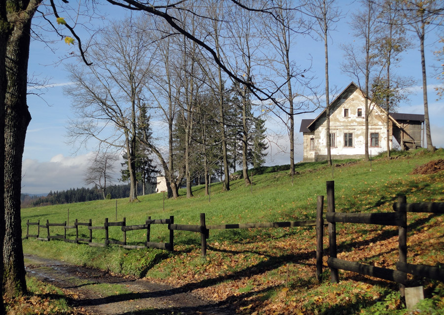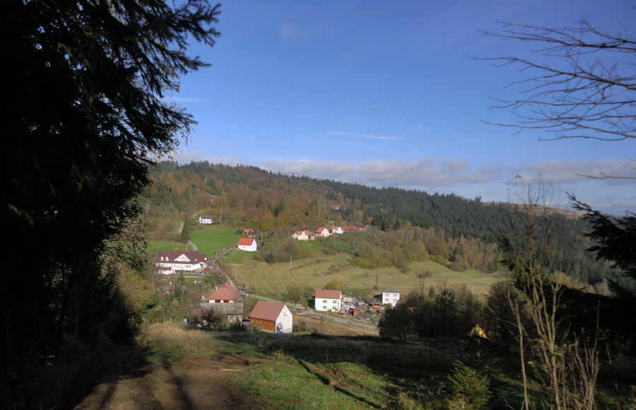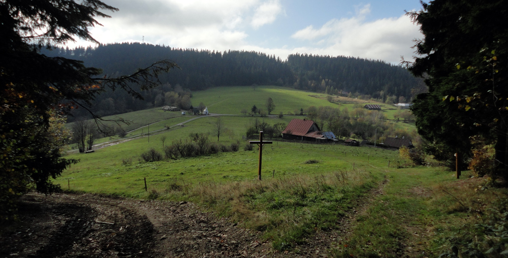 Vynáram sa na velikýýých lúkach, v každom ich kúte nejaká chalupa sa krčí, v strede na križovatke čerstvo zrenovovaná kaplnka, lavičky, prístrešok pre „guľášpartie“ s nevyhnutnou „nástenkou“. Ešte kúsok ďalej je sedlo Javorník so štátnou cestou, ale tam až nejdem, asfaltu si ešte dnes užijem. Lebo sa nebudem vracať rovnakou cestou, aj keď velím čelom vzad. Oprobujem južnými svahmi a dolinami popod hrebeň Javorníkov: najprv po zelenej dolu do osady Ivor (patrí Veľkému Rovnému), potom hore (stále po zelenej) nazad k Bielovcom, kde som dnes už bol. A odtiaľ už len z kopca, po žltej do Veľkého Poľa. Ide sa! Na začiatok tadeto: