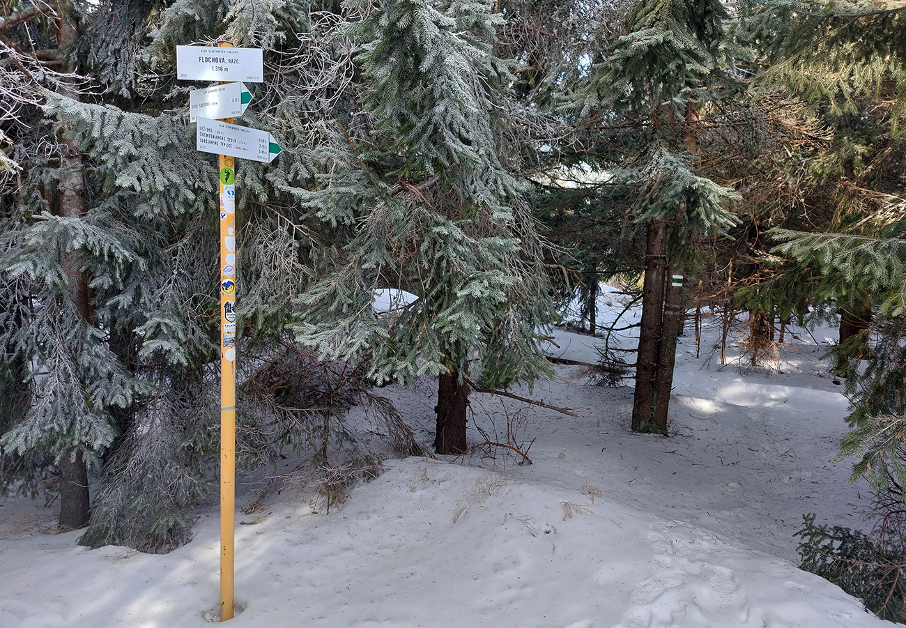 Najvyšší kopec Kremnických vrchov má síce 1319 m, ale je to zalesnený chrbát bez výhľadov a všetky cesty na tú „náhornú plošinu“ vedú lesmi, z veľkej časti hospodárskymi. Len hore je rezervácia. Zároveň ako pokračoval snehovo biedny február (skôr taký koniec marca), keď sa v noci vyjasnilo a všetko to zmrzlo, nechcelo sa mi lyžami dakde po ľade hrkotať, obul som trailovky. Vyšiel z toho okruh od vlaku k vlaku, z hororovej (Hostelovej?) stanice v Hornej Štubni. Samé zvážnice, len strmý záver výstupu na Flochovú od severu (po zelenej) po lesnom chodníku. Zároveň po poriadnom klzisku. Takže skôr tréning – pohodová vyklusávačka, iba za vrcholom, na jednom neprechodenom úseku lesnej cesty sa to trochu pod nohami borilo, inak ani na to prebáranie niet nikde snehu. A zvážnicové blatá pomrznuté a lúky nad dedinou suché, ani som nemal šancu sa zaprasiť. Takže spokojnosť, takto to vyzeralo: