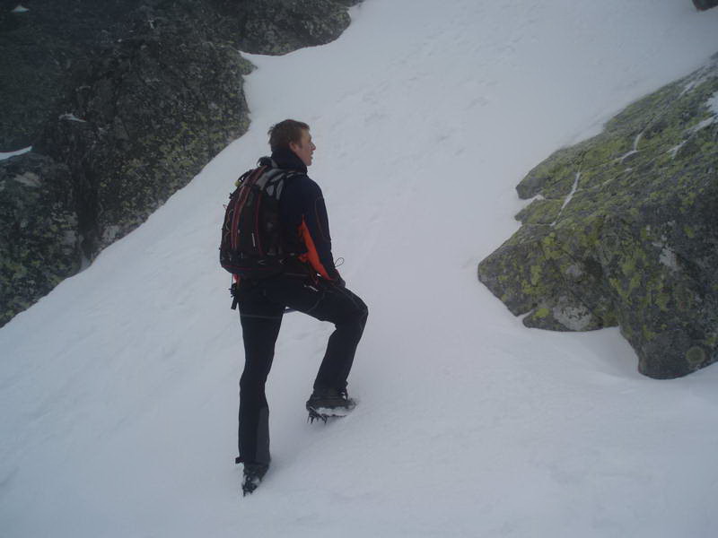 My ideme neohrozene za svojim cieľom, ktorý síce nevidíme, ale tam niekde v mrakoch bude. Terén začína byť strmší, s mačkami to však ide dobre. Maťovi chýba čakan, ktorý sme zabudli, ale zvláda to s prehľadom. Červená značka sa stráca niekde pod snehom a terén začína byť náročnejší. Dobehneme ešte posledného borca, ktorý to dotiahol dosť ďaleko, na to že bol v obyčajných topánkach a bez akéhokoľvek výstroja. Ani batoh nemal, asi preto tam tak čupel za skalou a bol roztrasený, že nestíhal ani dýchať.