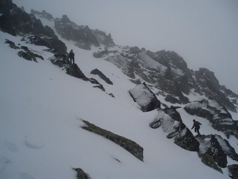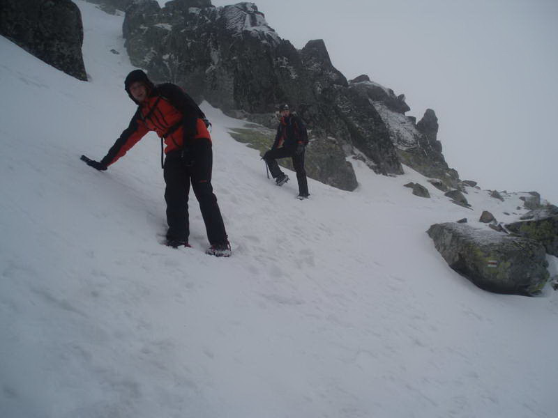 Dole zídeme po nevýraznom hrebienku. Tu stretáme troch už skutočných poľských horolezcov. Aj keď jeden čo mu vypla mačka v najexponovanejšom teréne vypadal skôr na začiatočníka, ale vyzbrojený boli všetci veľmi dobre. Prehodili sme pár slov. Pýtali sa ako je to s Tatrami u nás, či ich aj strážia keď sú zatvorené. Oni nám zase ukázali kadiaľ vedie výstupová cesta na Swinicu. Ale chalanov som už na to nedokázal prehovoriť. Terén tam bol dosť zaujímavý a na to sme neboli dostatočne pripravení.