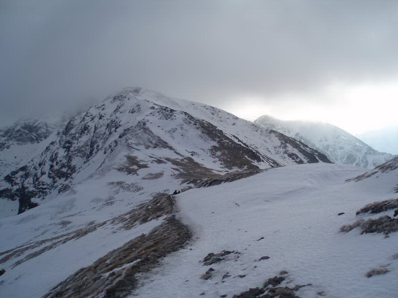 Nás čaká asi dvojhodinová prechádzka po zasneženom hrebeni do Svinického sedla (2050 m n.m.). V zimných podmienkach je to na pár úsekoch dosť exponované a tak obúvame „mačky besné“ a ideme ako píly. Samozrejme sme prenasledovaní skupinkou „priekopníkov poľského horolezectva“, ktorí to všetko dávajú v mestských topánkach a rifliach. Jeden mal batoh a jeden dokonca aj palice! V Svinickom sedle, zvíťazí zdravý rozum a otáčajú to, podľa hesla nikdy nie je neskoro aj keď majú asi už plné pudlá.