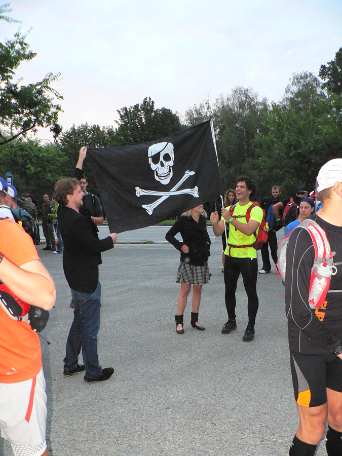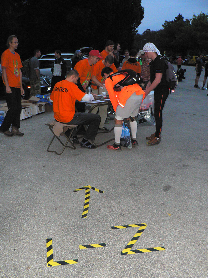 Pred štartom v Nitre: Novinkou bola prezentácia už večer. Dalo sa potom zapísať aj ráno, ale už vlani boli problémy všetko stihnúť. Teraz sa vďaka večernej prezentácii ráno všetko stihlo - zdalo sa, že celkom v pohode. Po parkovisku pobehovali za brieždenia divní panáčikovia s ruksačikmi, len jeden nemenovaný za sebou ťahal lodný kufor :-) Niektorí sa tvárili, že rozklusávajú, pritom ale hľadali čo najhustejší krík. Radov megafón išiel na plný výkon a dvojjazyčne! Chlapec mal tradične sklený pohľad, na pozdrav neodpovedal na prvý raz a potom už ten tlak zodpovednosti nevydržal a chcel sa ísť zastreliť či čo... Ale všetci išli za ním, tak si to rozmyslel, o siedmej strelil len tak do ľuftu a davy sa pohli.