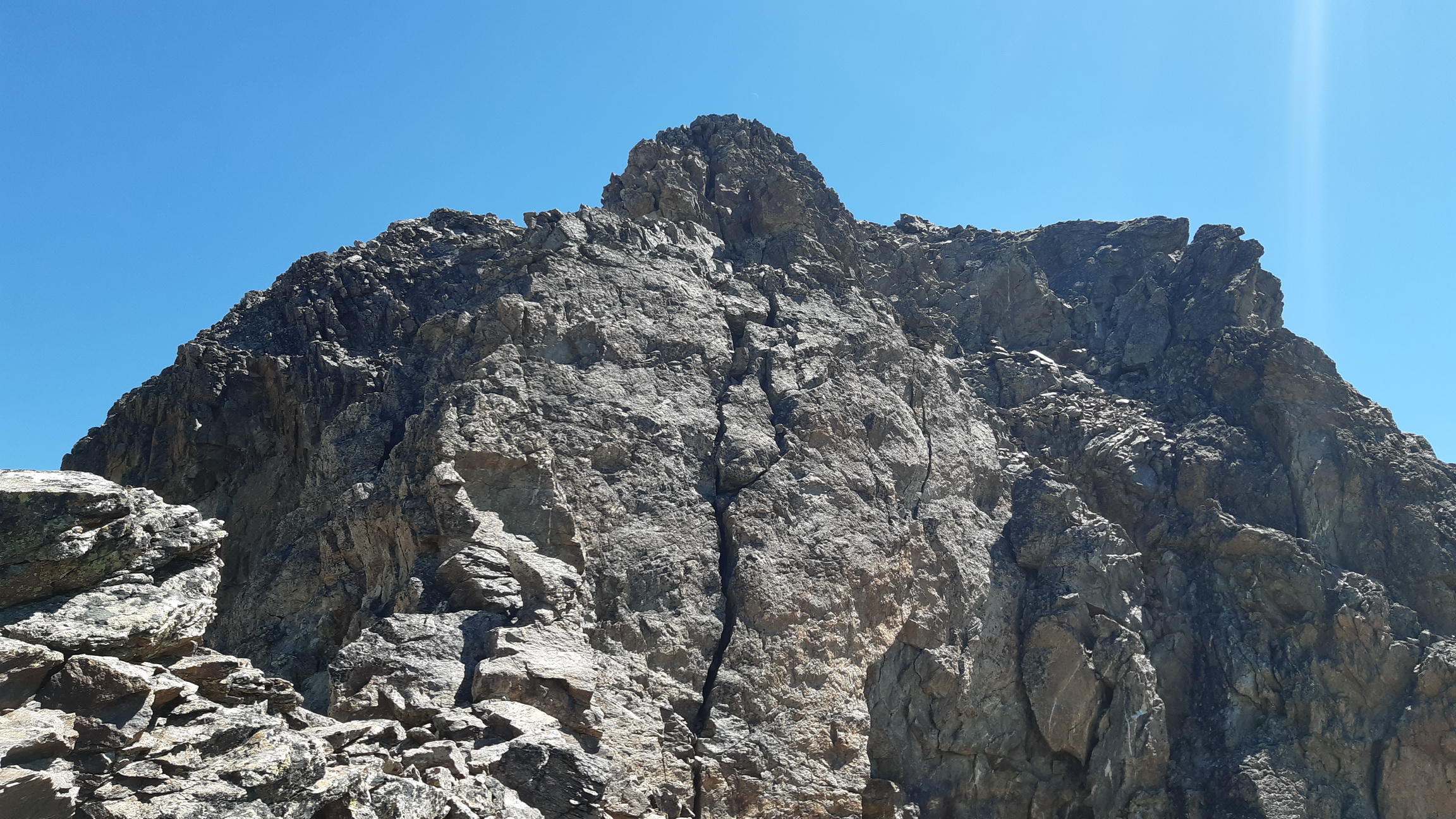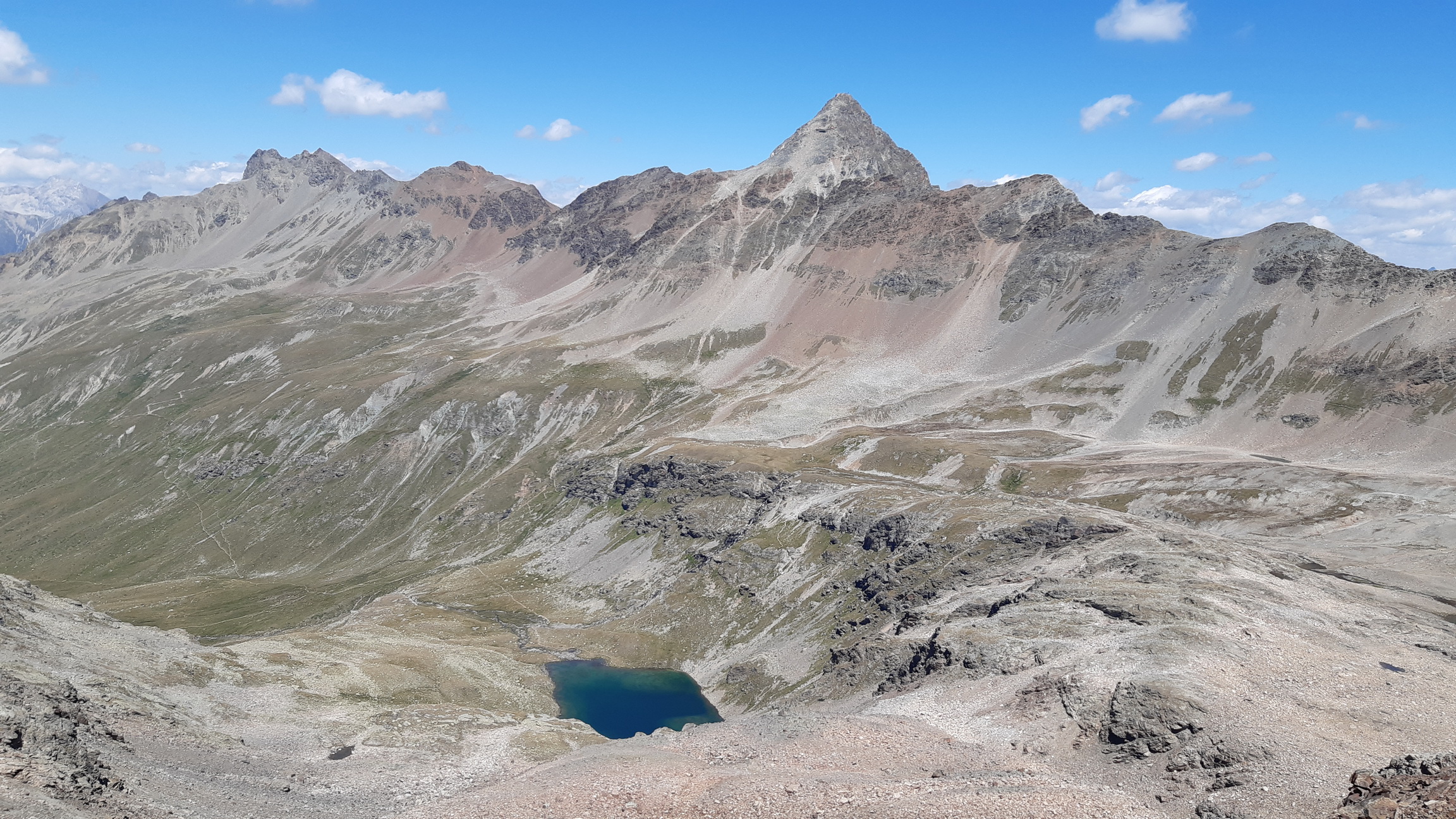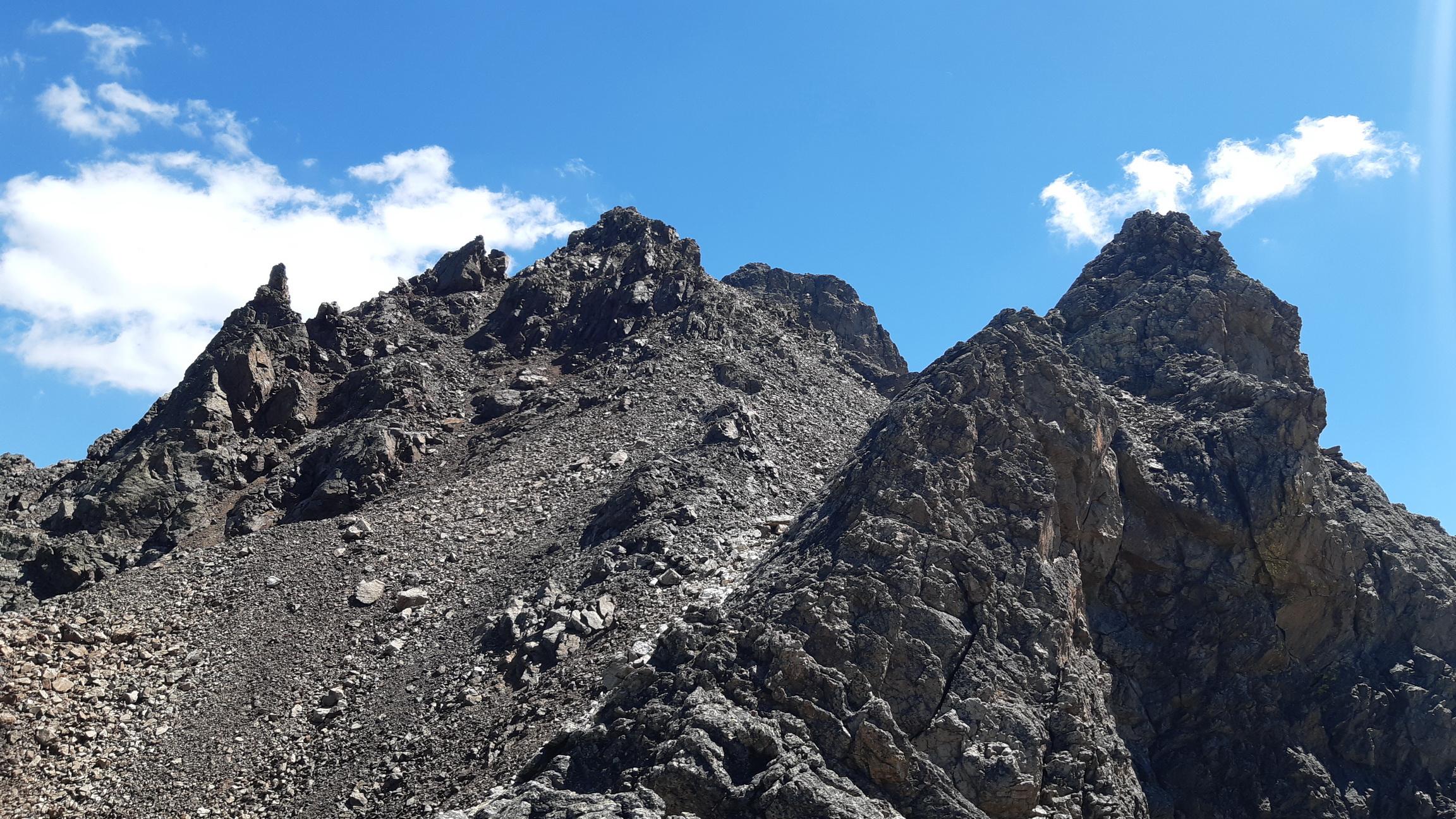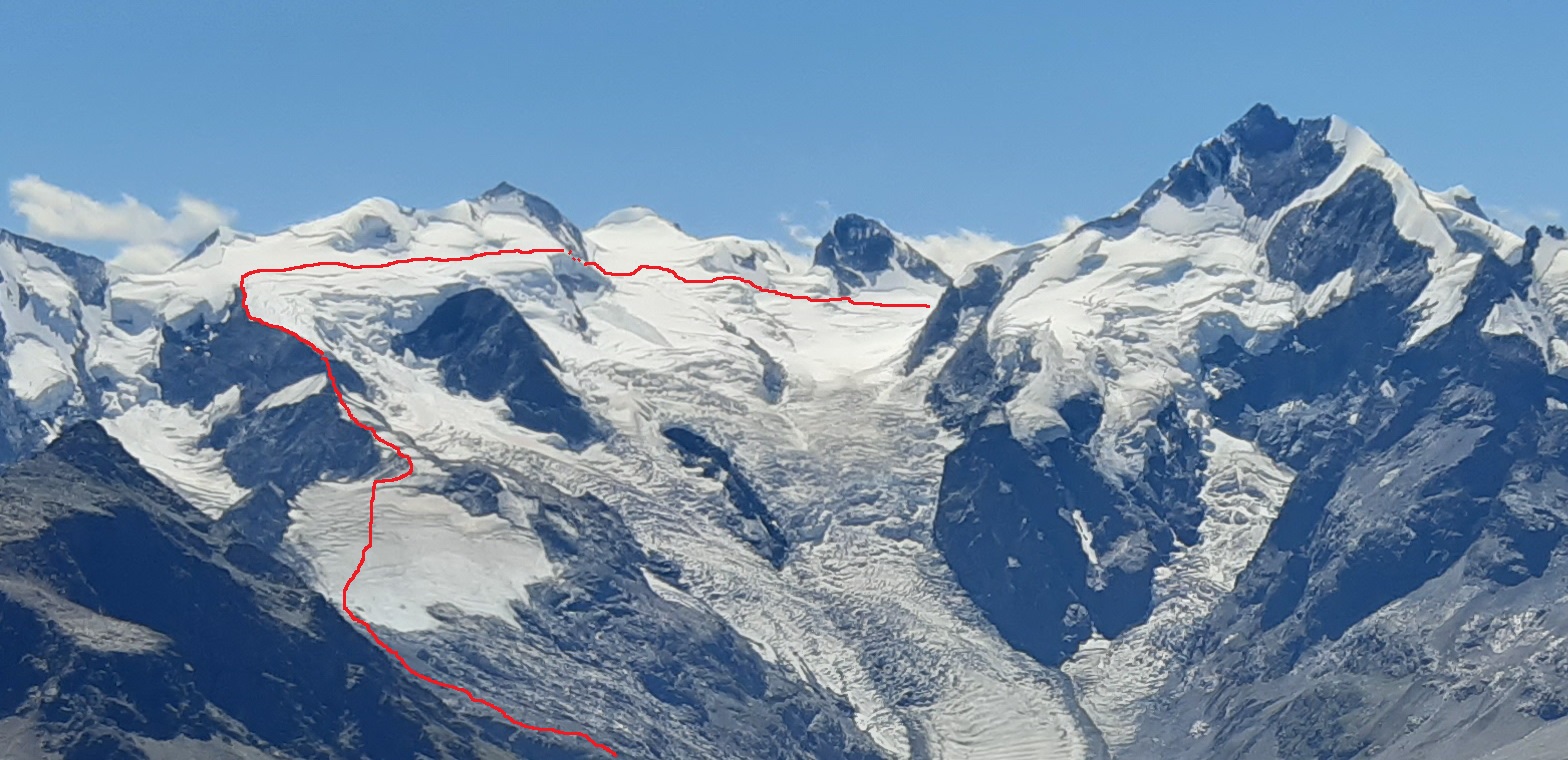 Najprv serpentínami smer Alp Languard, neskôr už hrebeňom smer Paradieshutte. Tu značka nevedie ďalej hrebeňom, vstupujem teda do môjho prirodzeného prostredia, opúšťam značkovaný chodník. Držím sa hrebeňa až prichádzam pod výraznú vežu, spomínanú cukrovú homoľu ako som ju pokrstil. Podarí sa mi nájsť kúsok lana na vých. hrebeni a pomerne ľahko (III.) sa dostanem na vrchol. Výhľady počas celej túry sú päťhviezdičkové, priznám sa že pri rozhodnutí sem ísť počasie hralo svoju úlohu. Kalkuloval som s možnosťou tých fotiek čo teraz môžete vidieť v článku.
