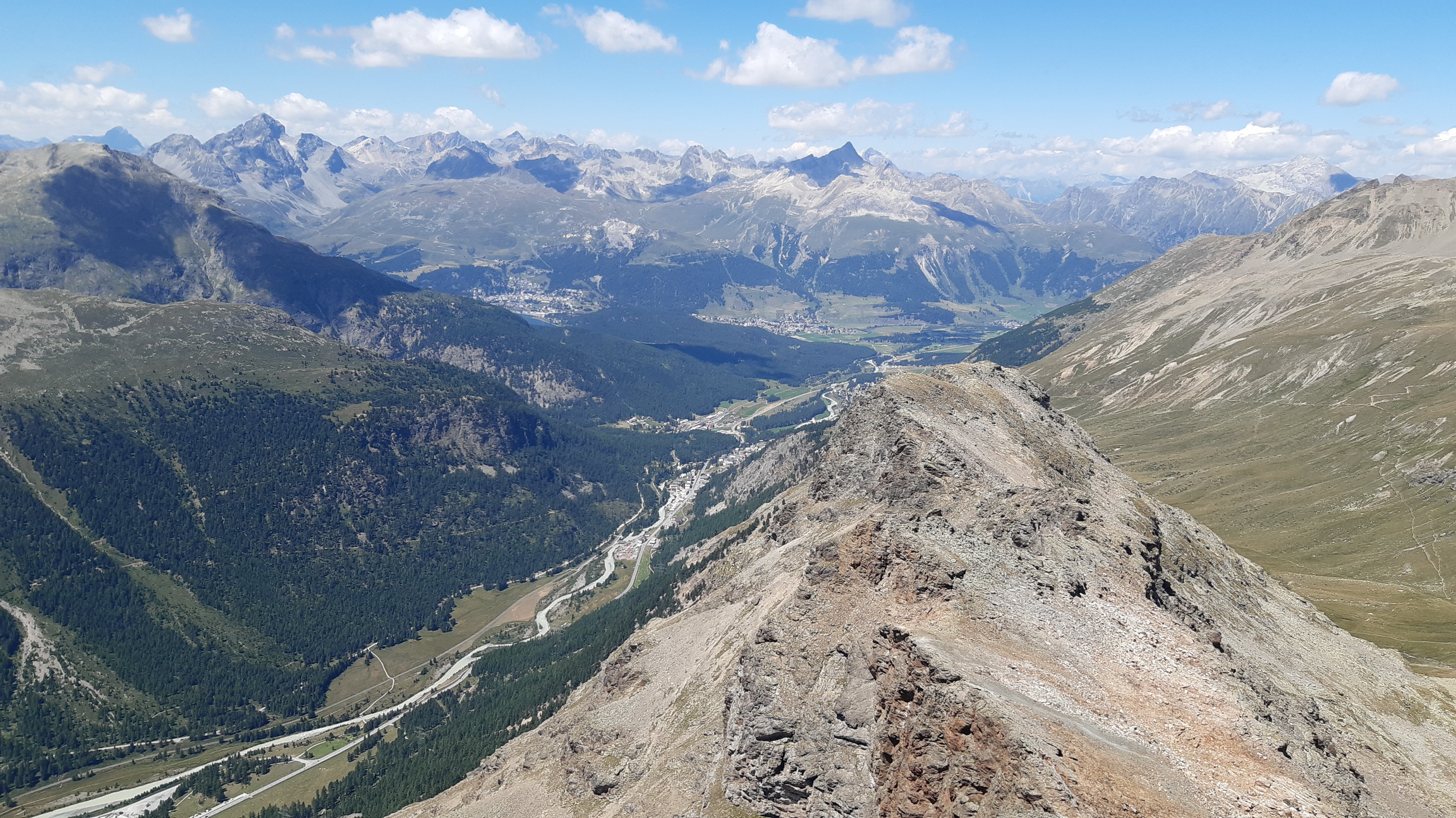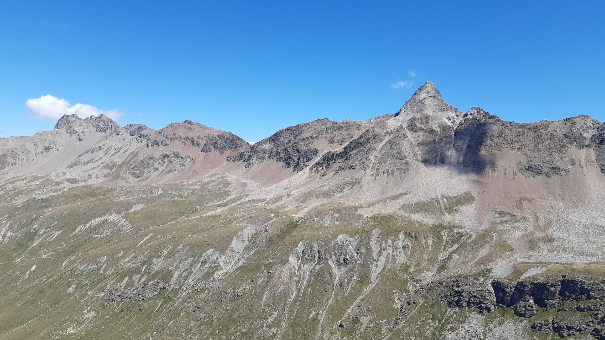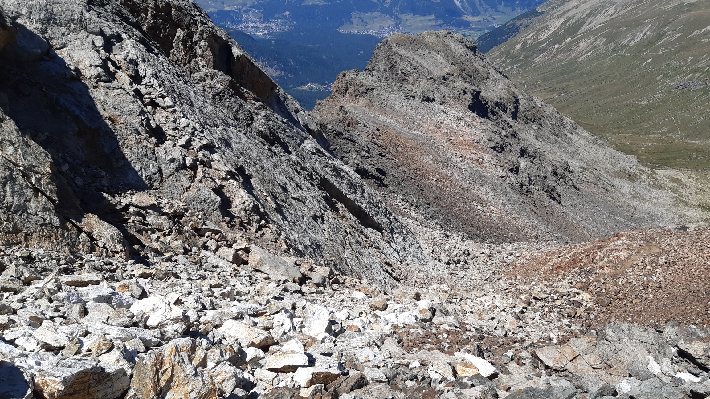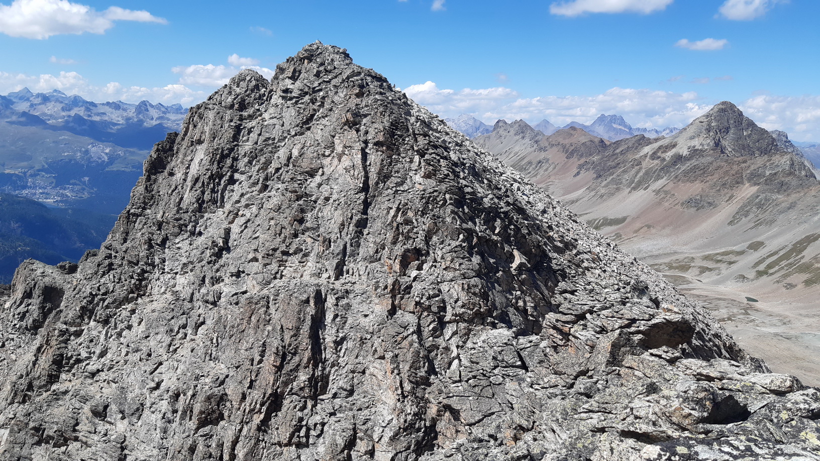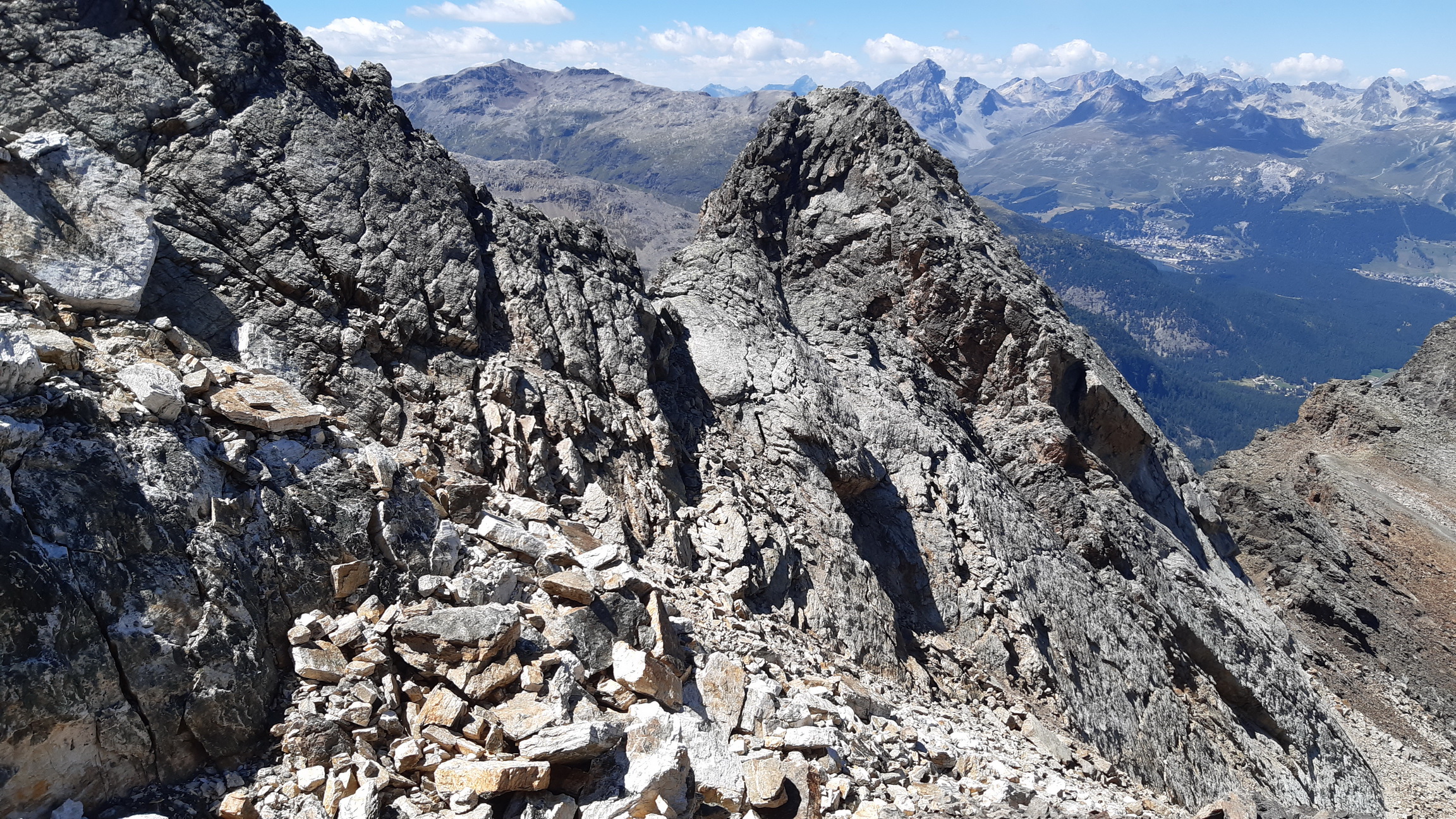 Tie výhľady sú úžasné a nielen smerom na Berninské Alpy. Spomínam na túry tu v okolí, odtiaľto mám všetko ako na dlani. Pamätám si spred 5 rokov, že ten hrebeň ďalej nebol zadarmo ale že to všade pustilo. Vtedy som šiel tento úsek tam i späť. Je to veľmi dôležité, že si pamätám tie kľúčové zliezania a vďaka tomu ostávam kľudný. Keby som tu bol prvý raz bolo by to zaujímavé veru.
