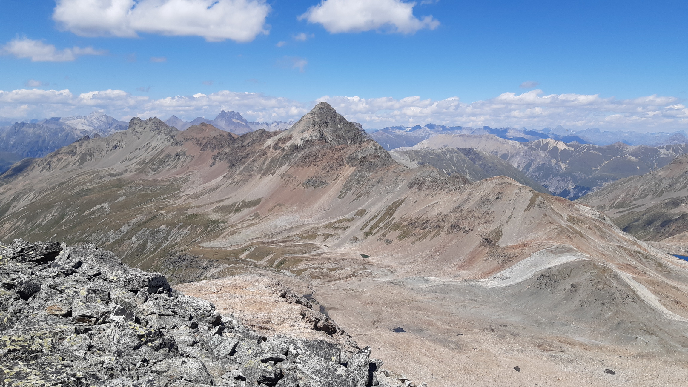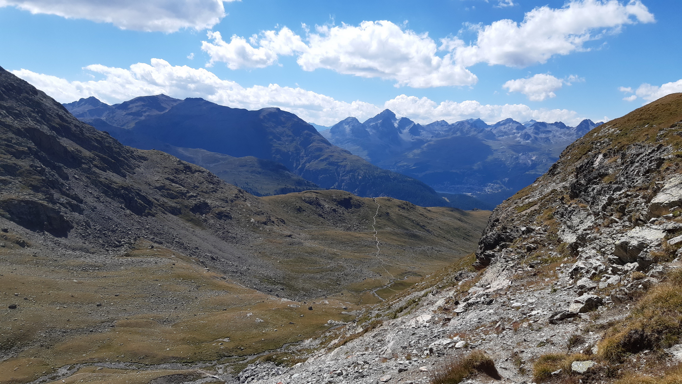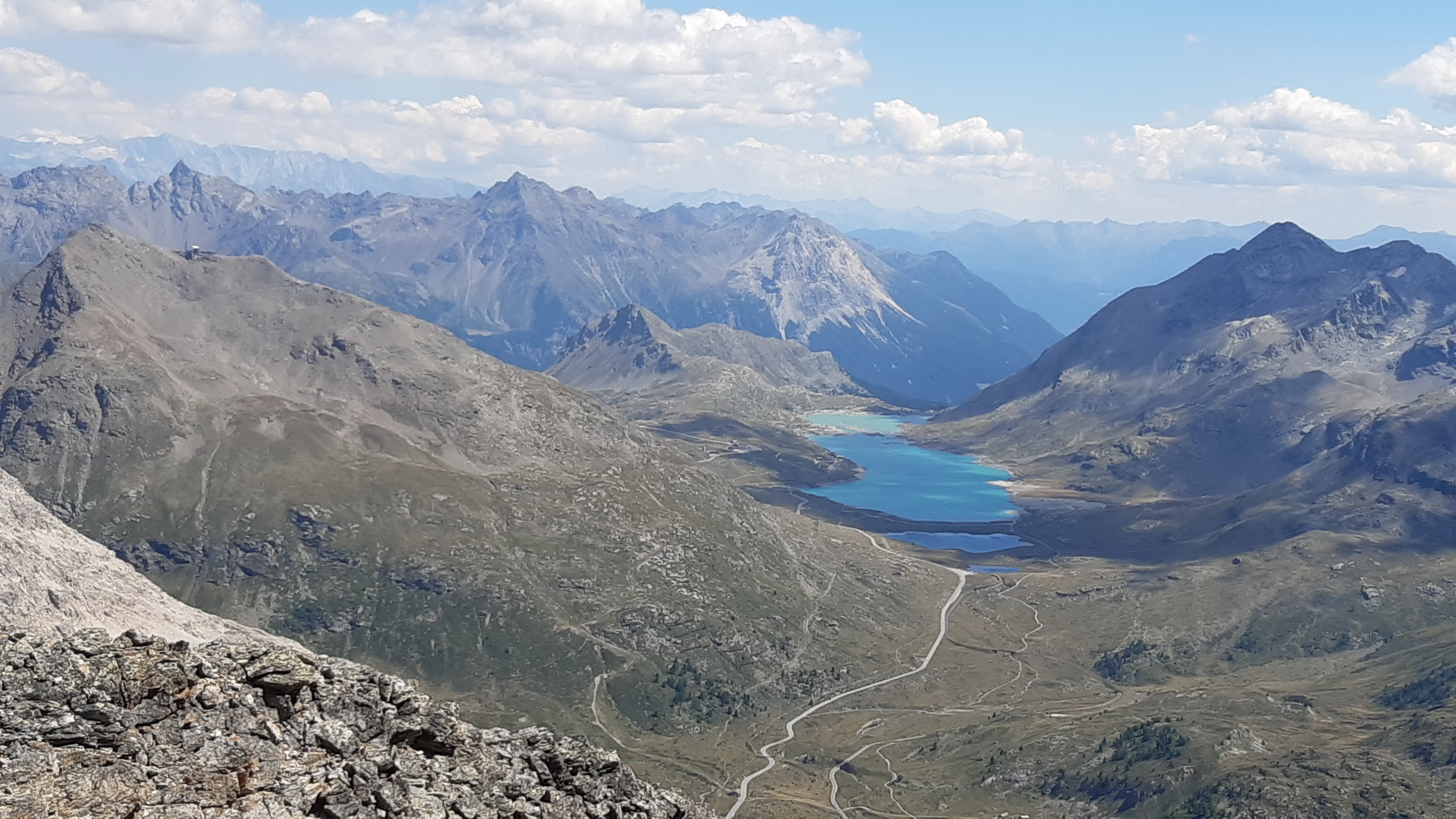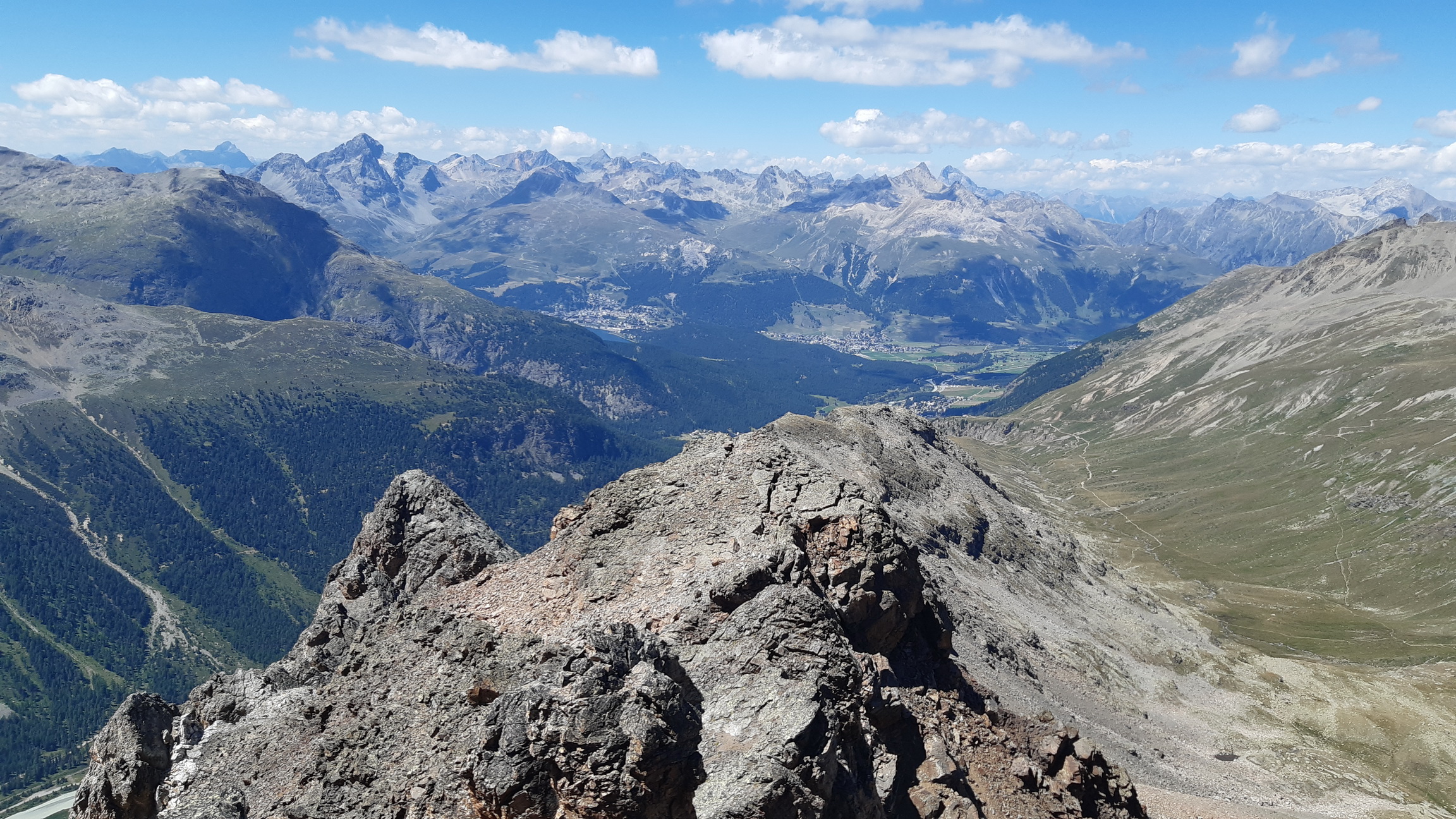 Tie výhľady sú úžasné a nielen smerom na Berninské Alpy. Spomínam na túry tu v okolí, odtiaľto mám všetko ako na dlani. Pamätám si spred 5 rokov, že ten hrebeň ďalej nebol zadarmo ale že to všade pustilo. Vtedy som šiel tento úsek tam i späť. Je to veľmi dôležité, že si pamätám tie kľúčové zliezania a vďaka tomu ostávam kľudný. Keby som tu bol prvý raz bolo by to zaujímavé veru.