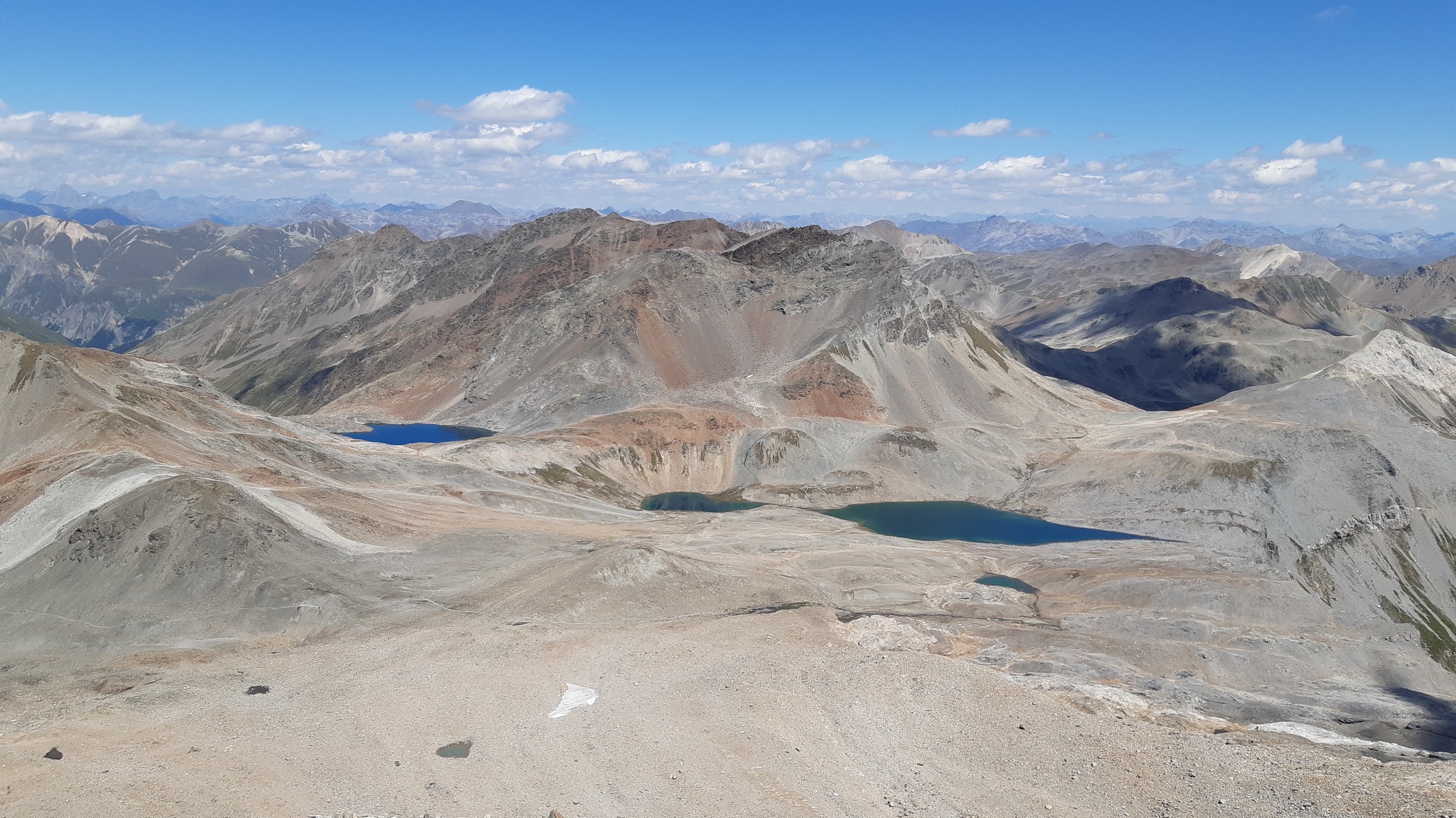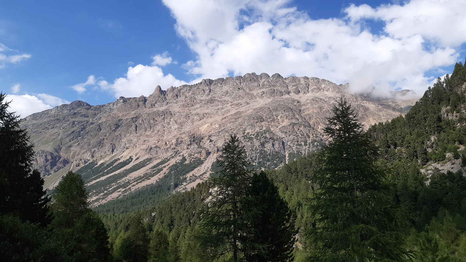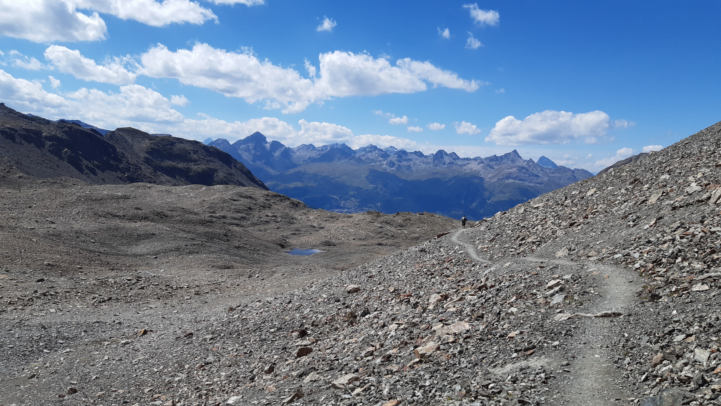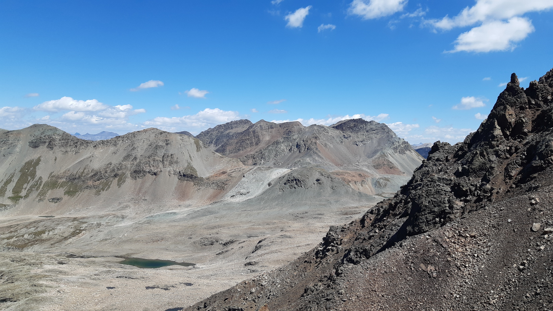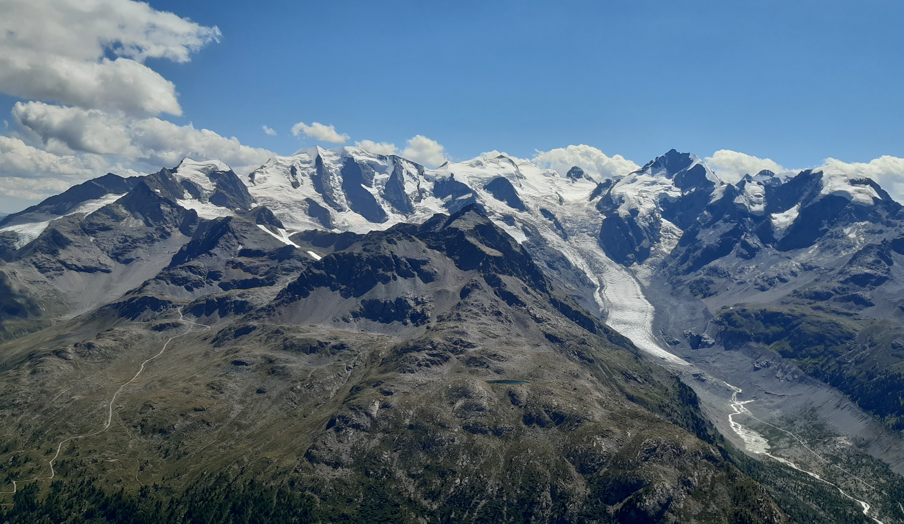 Tie výhľady sú úžasné a nielen smerom na Berninské Alpy. Spomínam na túry tu v okolí, odtiaľto mám všetko ako na dlani. Pamätám si spred 5 rokov, že ten hrebeň ďalej nebol zadarmo ale že to všade pustilo. Vtedy som šiel tento úsek tam i späť. Je to veľmi dôležité, že si pamätám tie kľúčové zliezania a vďaka tomu ostávam kľudný. Keby som tu bol prvý raz bolo by to zaujímavé veru.