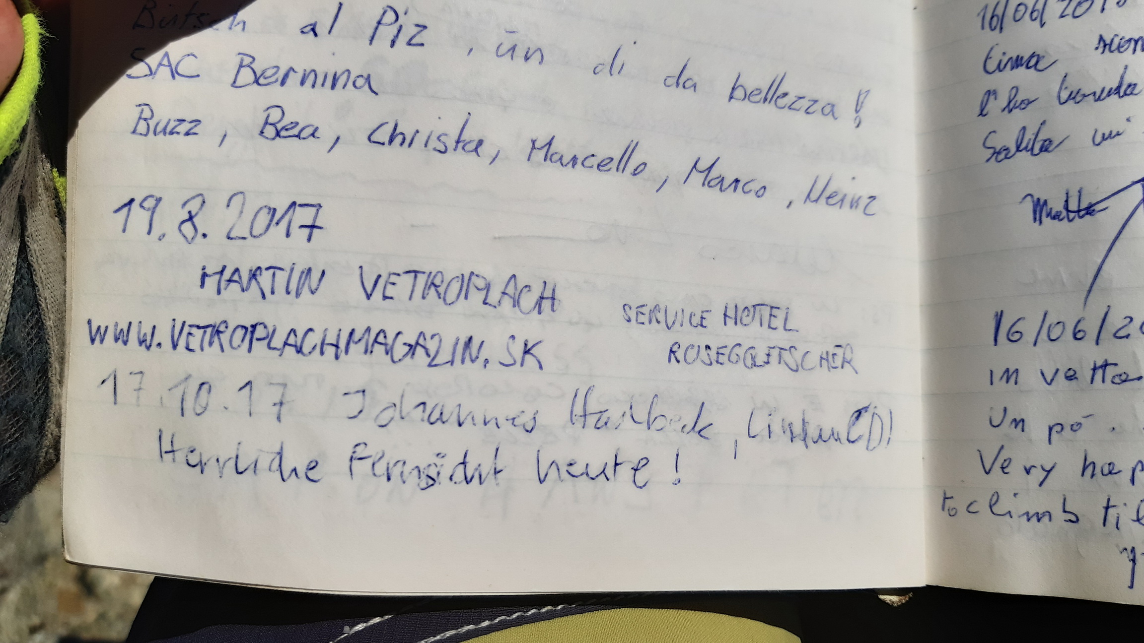 Po výstupe na homoľu pokračujem hrebeňom, čaká na mňa kľúčové miesto. Obliezam nejaké vežičky a v spomínanom výšvihu sa mi darí liezť po hrane. Je to síce vzdušné ale stále dobré stupy aj chyty. Vari ani trojka to nebola ale veľmi peké a vzdušné. Teším sa, že sa to podarilo a už otváram vrcholovú knižku na Piz Albris. Bol som tu pred 5 rokmi to je smiešnych 5 strán dozadu...