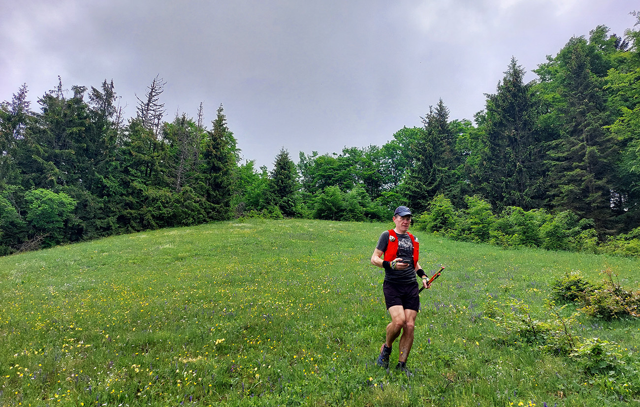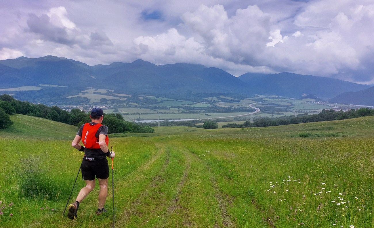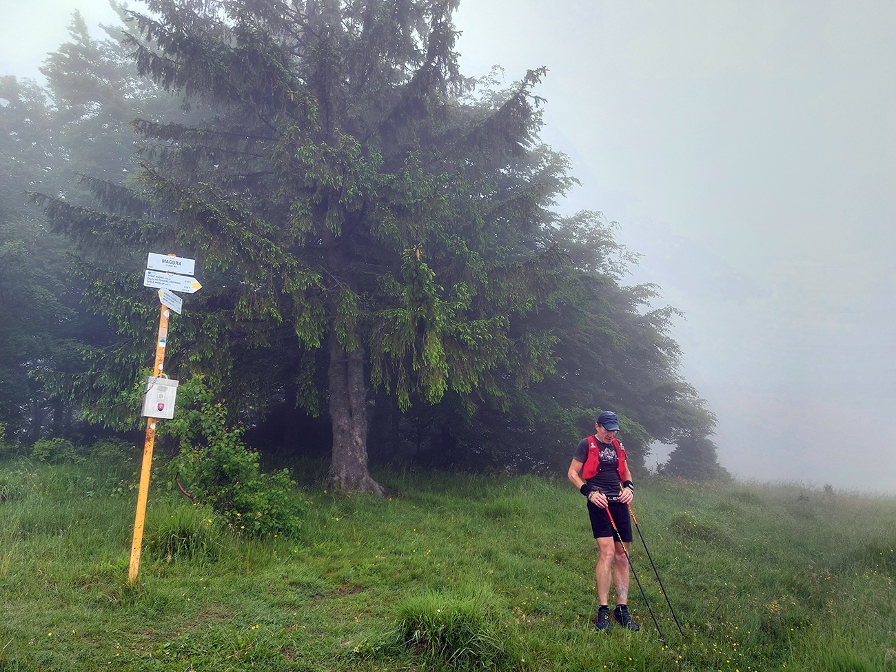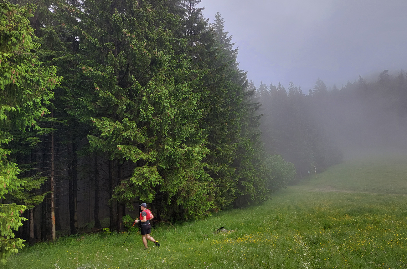 Na úvod rozklus popri Váhu pod kopec – už viem, že Majo je po štarte rýchly, tak som od stanice k nemu domov poctivo rozklusal, ale aj tak som potom ledva fučal. Asfaltka hore Nolčovom a od chaty odbočka doľava: mokrá, hlinená strmina na „Moguru“, ako ju vraj miestni volajú. Zatiaľ som stíhal, nohami aj pajšľami, tak sme aj poohovárali kdekoho. Aj Petra Fraňa, ktorý akurát pred pár hodinami bral parádny bronz na majstrovstvách sveta v ultrabehu - bomba chlap! Pri jeho zlepšovaní ostatné roky sa to asi dalo aj čakať, aj keď zdalo sa, že najmä organizátorov a kameramana v cieli tým poriadne zaskočil. Pritom ako tretí bežal dosť dlho a ten druhý mal v cieli ozaj na mále – ešte pár kiláčikov a... Ale dobre, o rok to takto bude hádam aj titul a už budú ozaj vedieť, s kým majú tú česť, budeme držať palce! Popri vykecávaní sme sa zo strmého lesa vynorili na strmé lúky a v topánkach nám hneď začalo čvachtať. Vlhko a dusno ako v Amazónii, hrebeň v mrakoch: