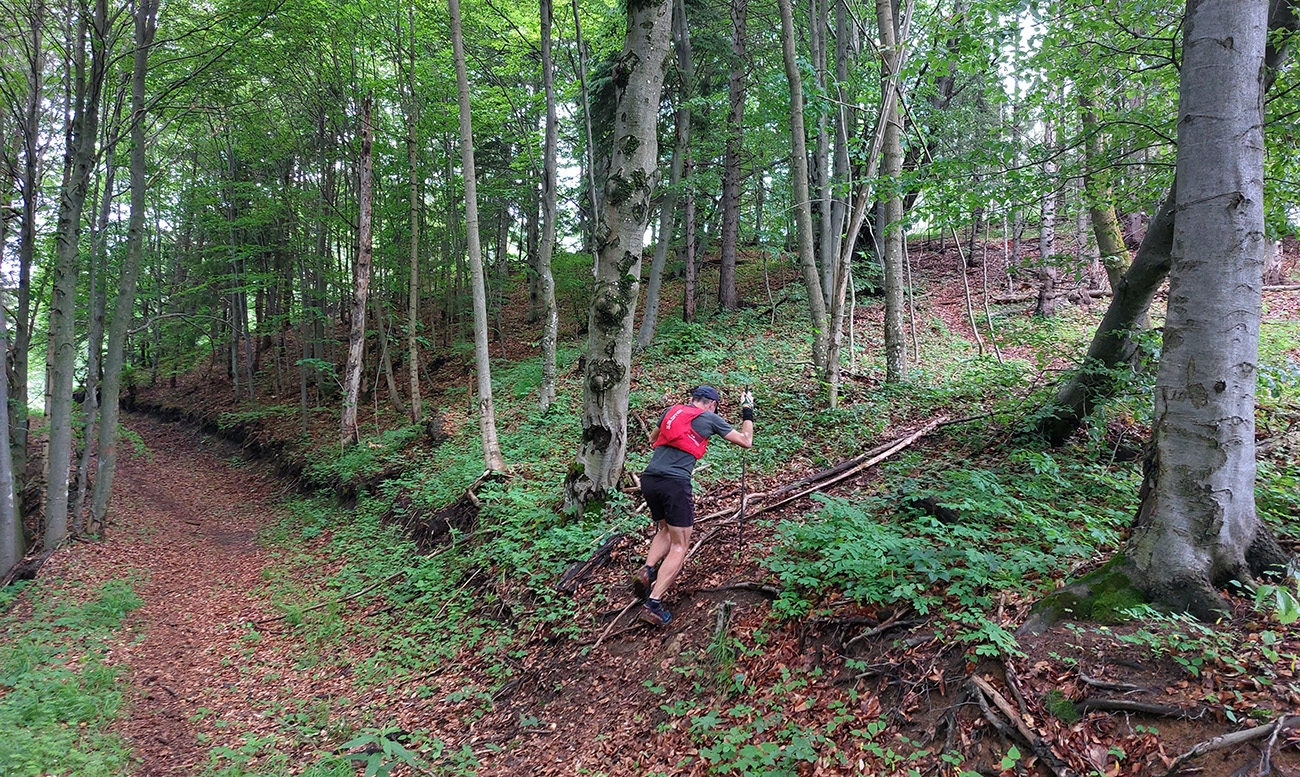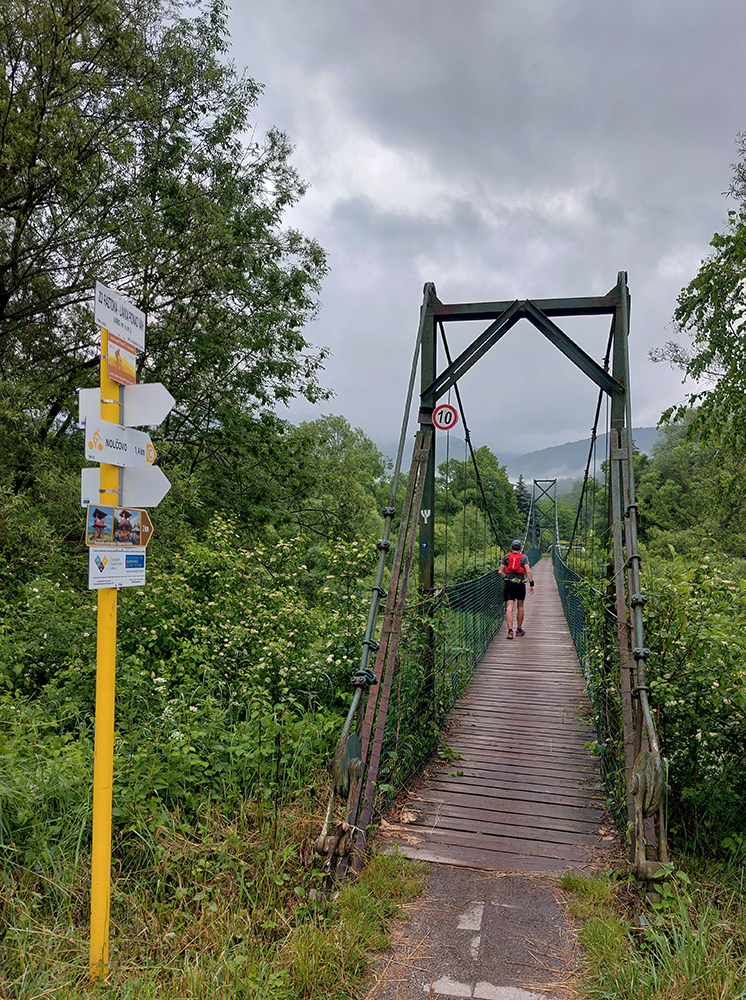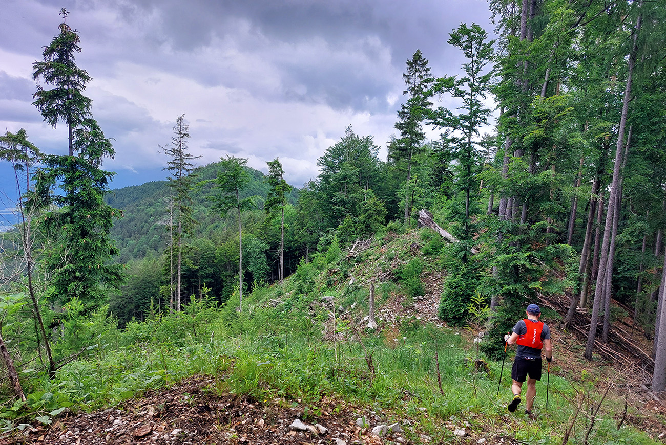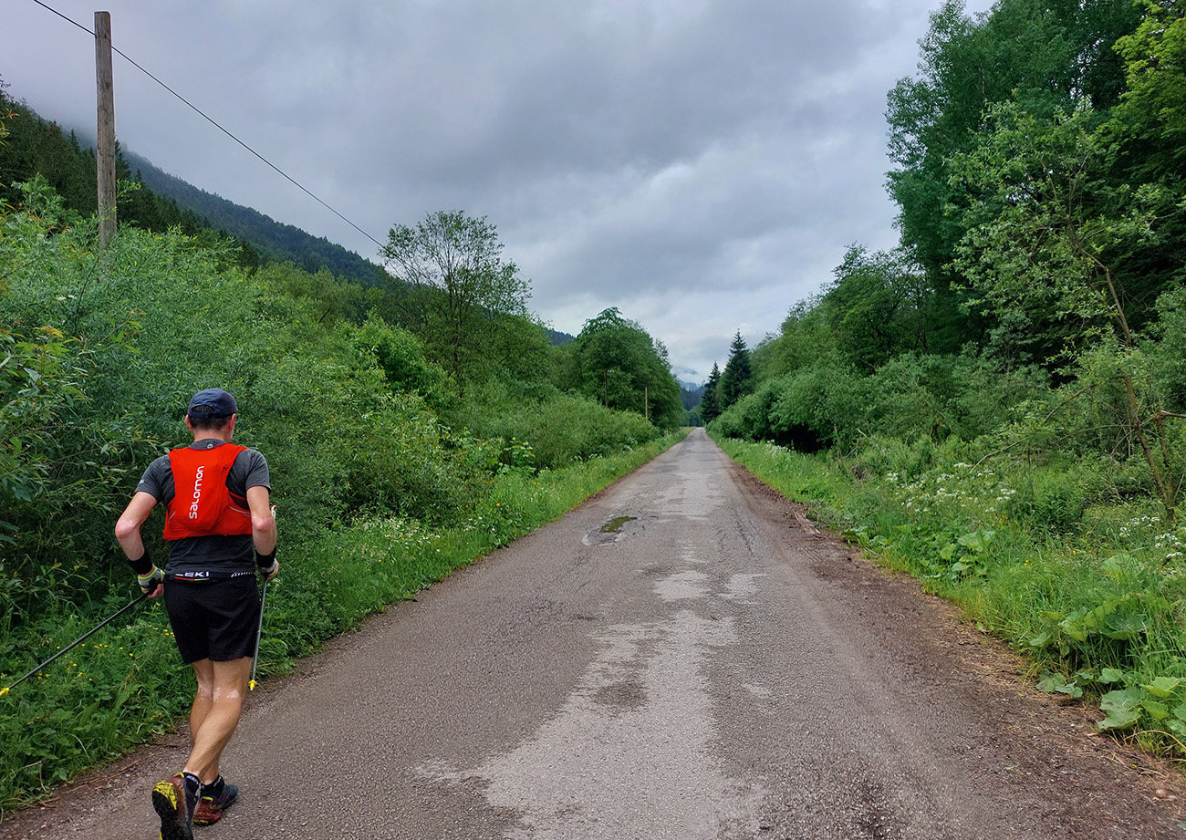 Na úvod rozklus popri Váhu pod kopec – už viem, že Majo je po štarte rýchly, tak som od stanice k nemu domov poctivo rozklusal, ale aj tak som potom ledva fučal. Asfaltka hore Nolčovom a od chaty odbočka doľava: mokrá, hlinená strmina na „Moguru“, ako ju vraj miestni volajú. Zatiaľ som stíhal, nohami aj pajšľami, tak sme aj poohovárali kdekoho. Aj Petra Fraňa, ktorý akurát pred pár hodinami bral parádny bronz na majstrovstvách sveta v ultrabehu - bomba chlap! Pri jeho zlepšovaní ostatné roky sa to asi dalo aj čakať, aj keď zdalo sa, že najmä organizátorov a kameramana v cieli tým poriadne zaskočil. Pritom ako tretí bežal dosť dlho a ten druhý mal v cieli ozaj na mále – ešte pár kiláčikov a... Ale dobre, o rok to takto bude hádam aj titul a už budú ozaj vedieť, s kým majú tú česť, budeme držať palce! Popri vykecávaní sme sa zo strmého lesa vynorili na strmé lúky a v topánkach nám hneď začalo čvachtať. Vlhko a dusno ako v Amazónii, hrebeň v mrakoch:
