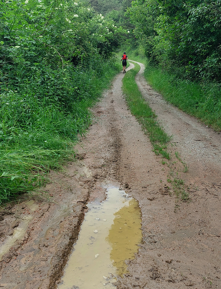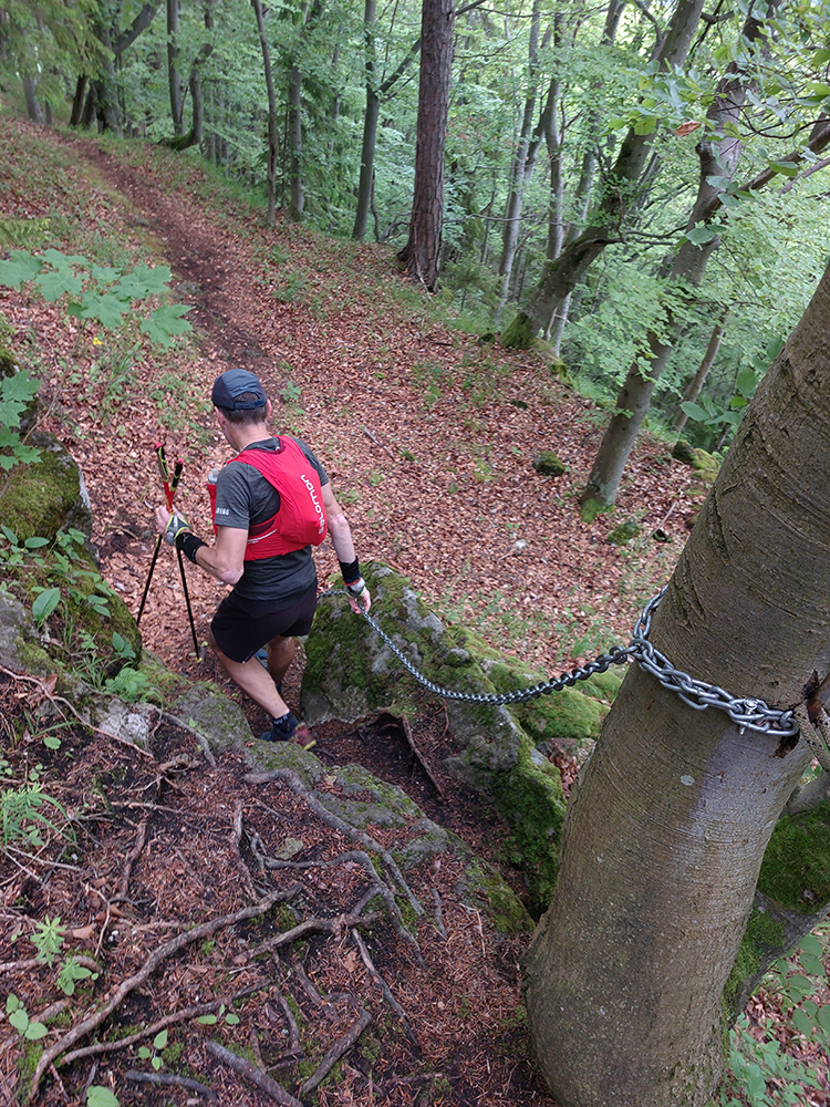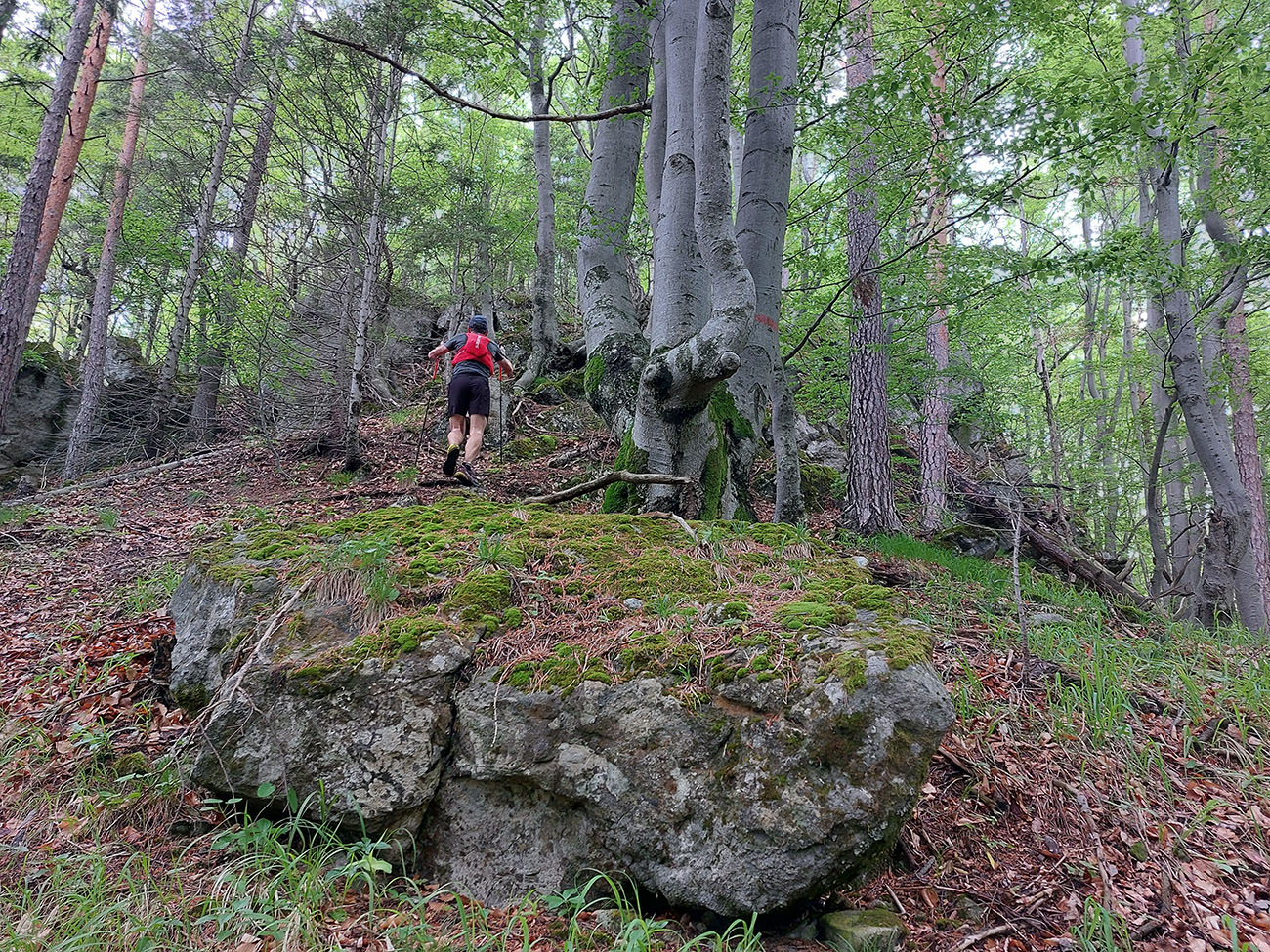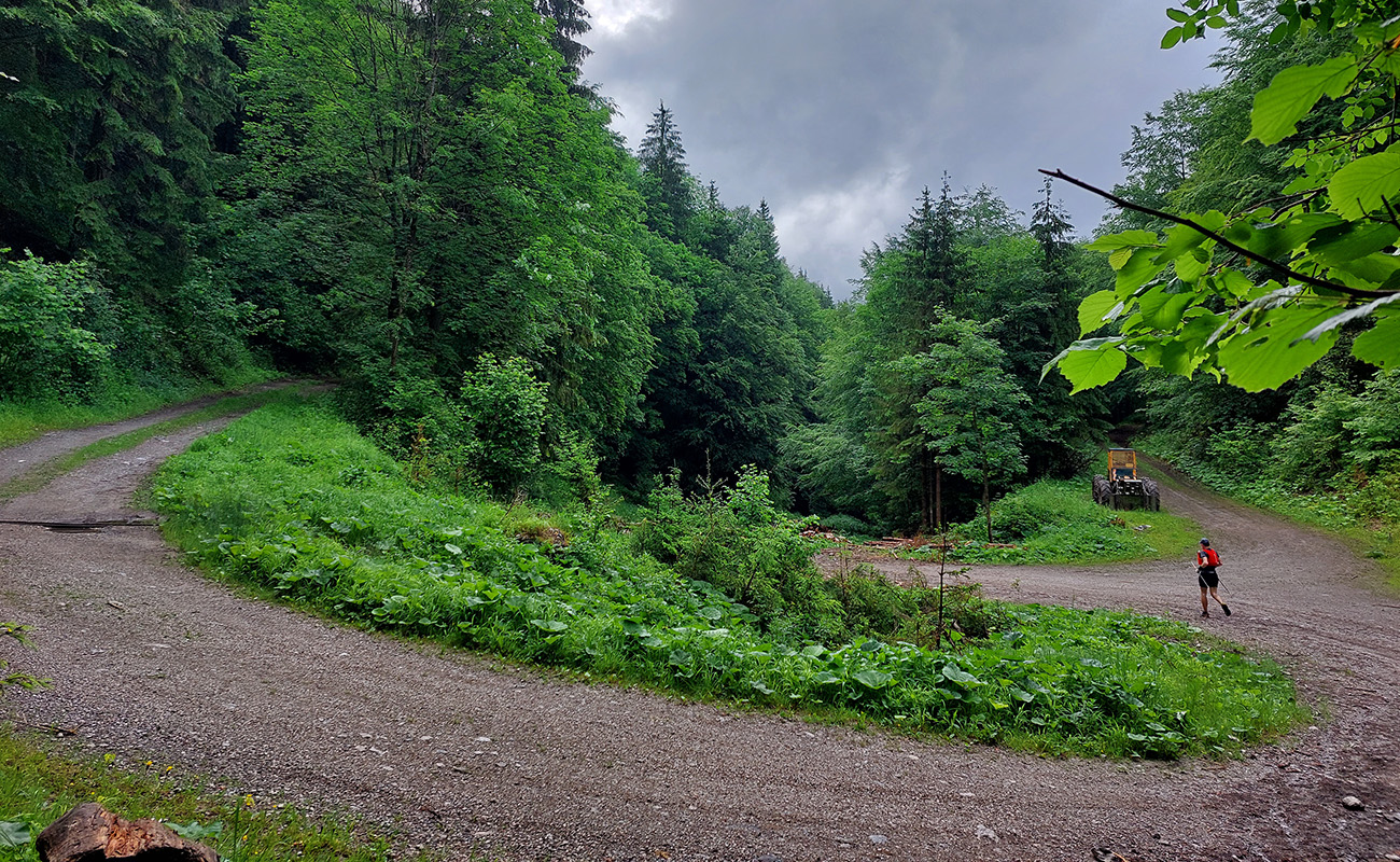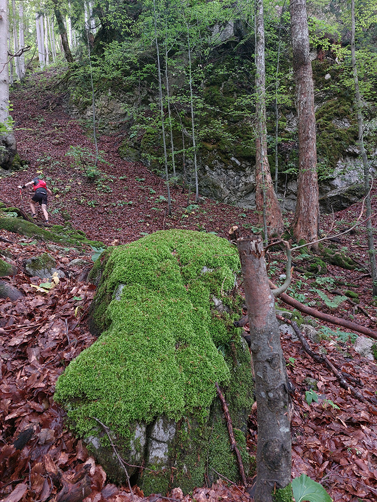Na úvod rozklus popri Váhu pod kopec – už viem, že Majo je po štarte rýchly, tak som od stanice k nemu domov poctivo rozklusal, ale aj tak som potom ledva fučal. Asfaltka hore Nolčovom a od chaty odbočka doľava: mokrá, hlinená strmina na „Moguru“, ako ju vraj miestni volajú. Zatiaľ som stíhal, nohami aj pajšľami, tak sme aj poohovárali kdekoho. Aj Petra Fraňa, ktorý akurát pred pár hodinami bral parádny bronz na majstrovstvách sveta v ultrabehu - bomba chlap! Pri jeho zlepšovaní ostatné roky sa to asi dalo aj čakať, aj keď zdalo sa, že najmä organizátorov a kameramana v cieli tým poriadne zaskočil. Pritom ako tretí bežal dosť dlho a ten druhý mal v cieli ozaj na mále – ešte pár kiláčikov a... Ale dobre, o rok to takto bude hádam aj titul a už budú ozaj vedieť, s kým majú tú česť, budeme držať palce! Popri vykecávaní sme sa zo strmého lesa vynorili na strmé lúky a v topánkach nám hneď začalo čvachtať. Vlhko a dusno ako v Amazónii, hrebeň v mrakoch: