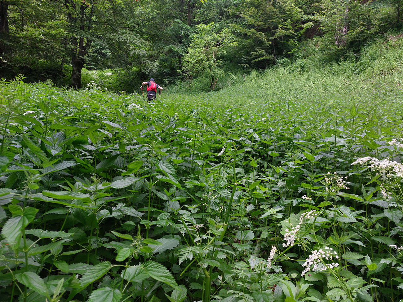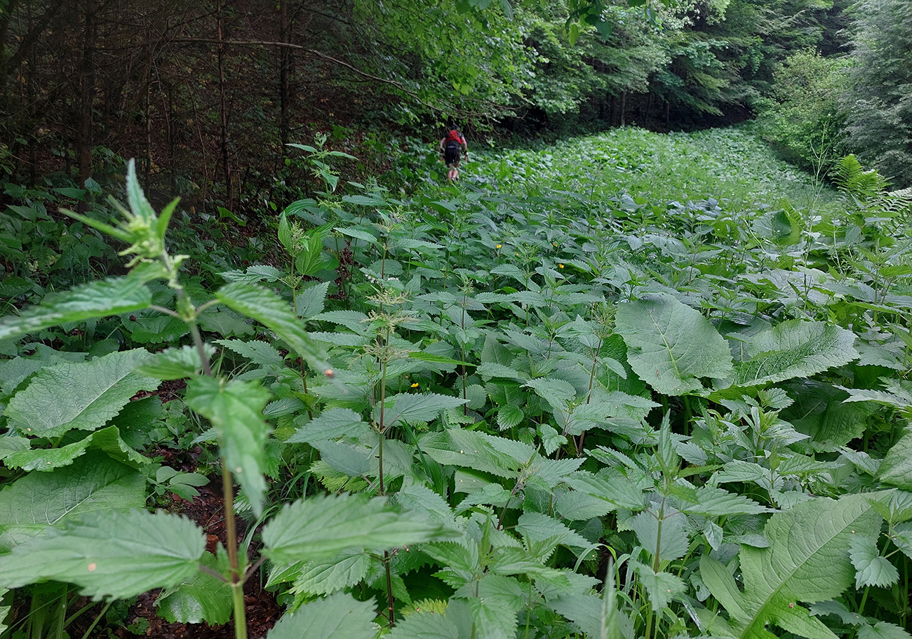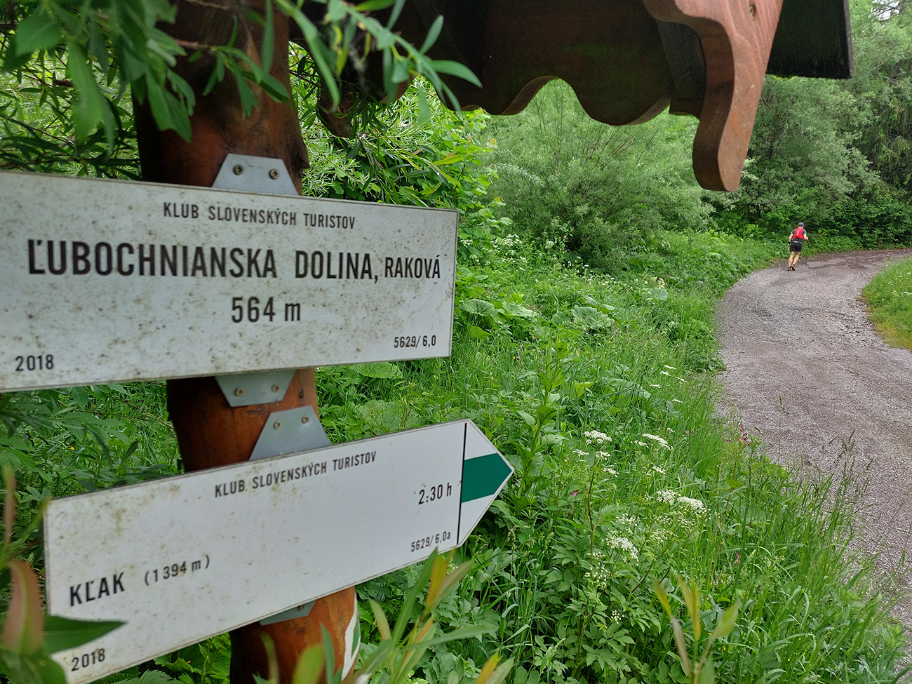Dole nevyhnutná asfaltovačka, ale len zo dva kiláky k detskému sanatóriu. No achillovky som už začínal cítiť. Ráno bolo telo síce nabudené, ale predsa len „vkm“ zanechal stopy. Dúfam, že nie nezmazateľné. Potom za sanatóriom doprava, ešte trochu starej asfaltky v bočnej doline a nasledovala antireumatická profylaxia. Lebo táto zelená hore na Kľak nie je ktovieako frekventovaná, a podľa toho aj ten chodník vyzerá. Teda skôr nevyzerá, ako ho na lúkach často nevidno v tých lopúchoch a najmä v žihľave. Joj, ale bola ešte silná, takto začiatkom leta :-) A dlhé gate ultras nenosia. Plus poriadny bordel pod nohami, plus poriadna strmosť, no dal ten výstup zabrať. Majovi s palicami a formou v batohu, tomu sa išlo... Aspoň, že to more medvedieho cesnaku poriadne voňalo.