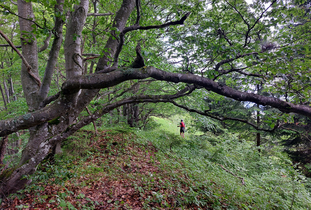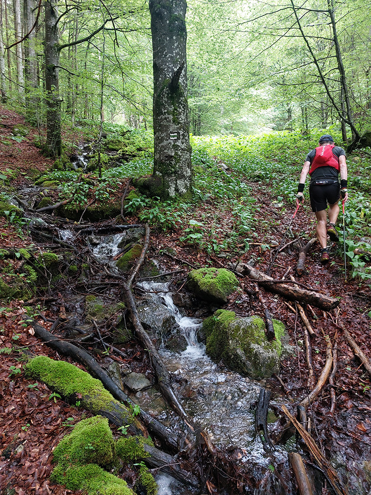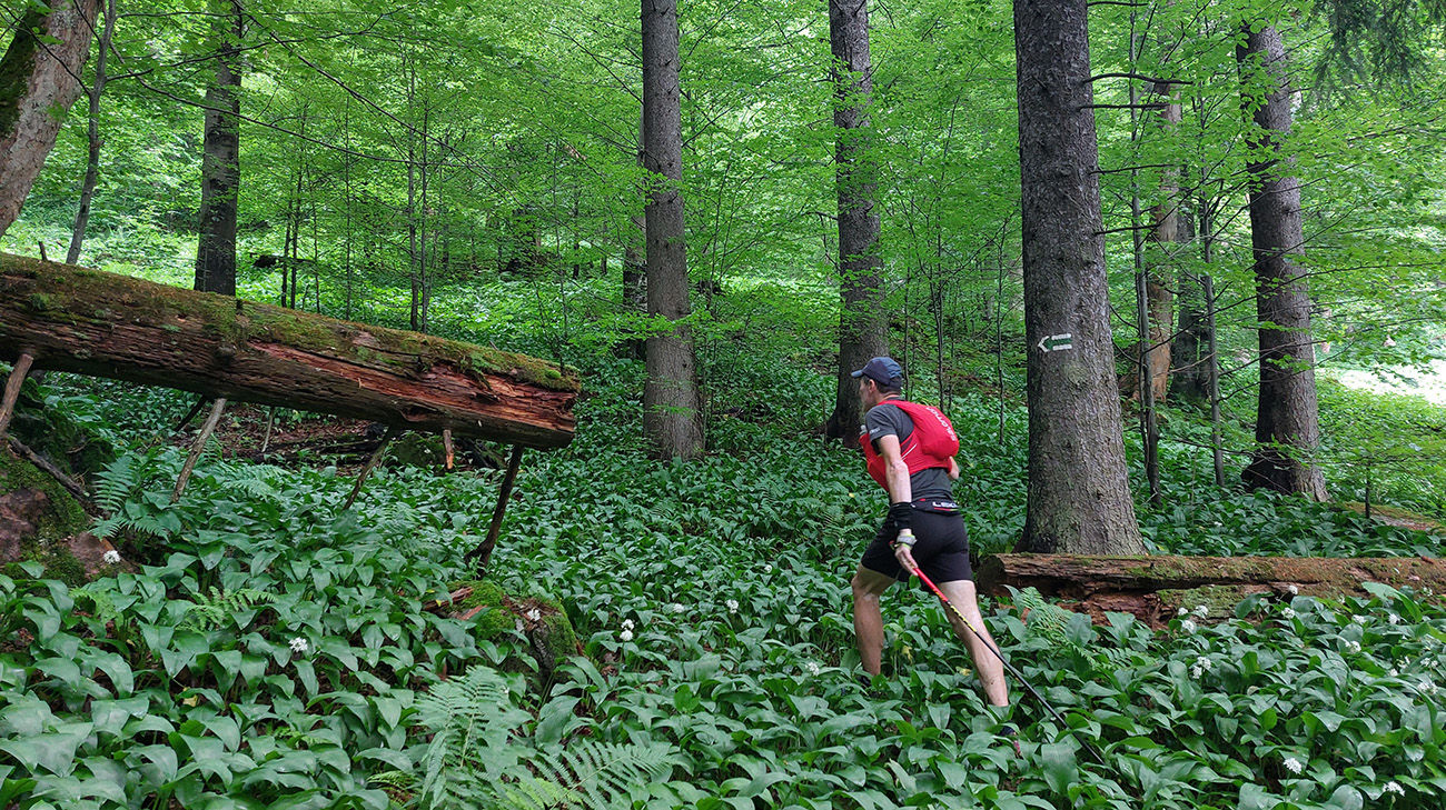 Dole nevyhnutná asfaltovačka, ale len zo dva kiláky k detskému sanatóriu. No achillovky som už začínal cítiť. Ráno bolo telo síce nabudené, ale predsa len „vkm“ zanechal stopy. Dúfam, že nie nezmazateľné. Potom za sanatóriom doprava, ešte trochu starej asfaltky v bočnej doline a nasledovala antireumatická profylaxia. Lebo táto zelená hore na Kľak nie je ktovieako frekventovaná, a podľa toho aj ten chodník vyzerá. Teda skôr nevyzerá, ako ho na lúkach často nevidno v tých lopúchoch a najmä v žihľave. Joj, ale bola ešte silná, takto začiatkom leta :-) A dlhé gate ultras nenosia. Plus poriadny bordel pod nohami, plus poriadna strmosť, no dal ten výstup zabrať. Majovi s palicami a formou v batohu, tomu sa išlo... Aspoň, že to more medvedieho cesnaku poriadne voňalo.