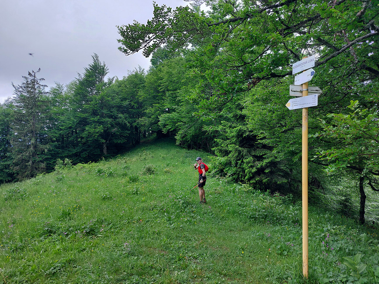 Po pekných lúkach sme boli rýchlo, lebo po rovine, v sedle Príslop, cestou sme nemohli nestrčiť jazyky do napájadiel – fajnááá vodička, ako vždy. A potom, po zošupe k smerovníku, davaj neznačeným, ale jasným priesekom doľava, na zvážnicu vedúcu na dno Ľubochnianskej doliny. Cestou dole, kluskajúc vedľa seba, akurát sme preberali, že tu skôr ako hore nejakého zvera zbadáme, keď sa nám za zákrutou do výhľadu vynorilo jelenie stádočko. Potom už kľud a okrem slimákov nič, až domov. Zbeh pohodlný, tu je to aj na gravelový bajk.
