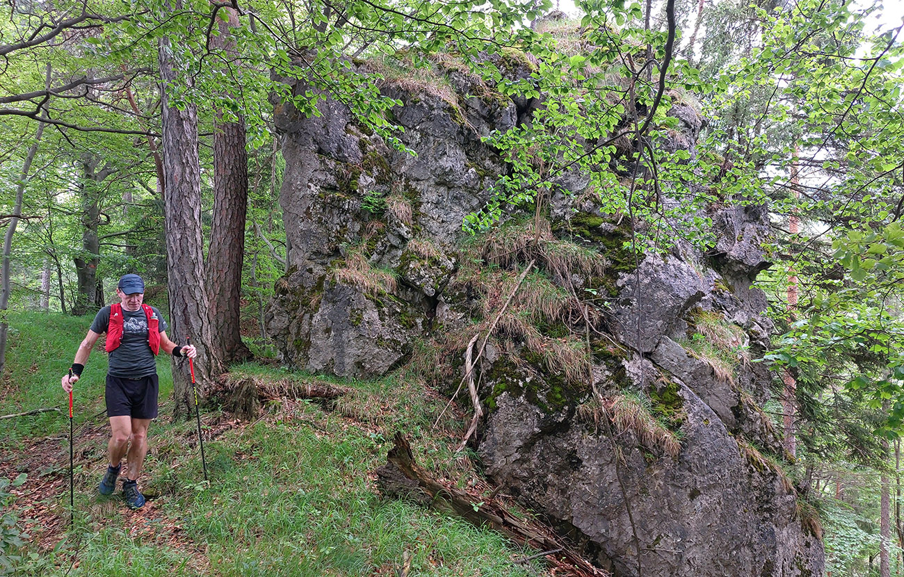 Hore hmla a kratučká pauza na malé kalorické prehryznutie, aspoň nás mokrých ako myši trochu ovialo. A davaj strmo dole, na Koškárovskú lúku, po žltej a modrej. Na lúke, od smerovníka, sa značky rozutekali, každá do inej doliny, a my ďalej po hrebienku, smer Sučiansky hrad. Bol som tu vždy buď na jar alebo na jeseň, chodník som si pamätal ako viditeľný, ale teraz vo vysokej tráve akosi ho nebolo. Ale tu niet kam zo správneho smeru odblúdiť, jedine strmo dole, do doliny. Tak sme sa pekne držali hrebienka a striedali pekné a škaredšie úseky, lúky a lesíky. Hajlajtom je tu malá, ale efektná skalná tiesňava pod Rúbaňou (1048 m). Potom už len skalky a bralká tesne pred hradom. Parťák tam ešte nebol, tak si pochvaľoval. Po tej zelenej na Kľak tiež ešte nešiel, ale tam to moc nechválil, ktovie prečo, hehehe...
