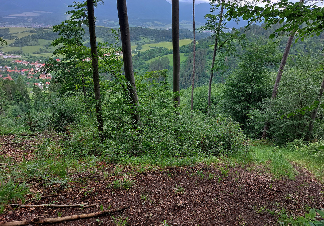 V Podhradí som šibol priamo na zastávku a rozlúčil sa s Majom, nech ho nebrzdím, lebo už som mal fakt dosť a o päť minút išiel autobus do MT. Lenže potom som si všimol krížik – iba v nedeľu, kuakua! Bola sobota, tak nič, tak posledné do kopca šmatľanie, ešte že po asfaltke, do sedielka nad Konským. No, aspoň som sa o vlastné nohy nepotkýnal, ako v lese. Našťastie to dlho netrvalo a už sme točili doľava na šotolinu, kombinovanú s blatom okolo kaluží. Bonusom boli čerstvé medvedie stopy. Ešte jedna strmšia serpentínka a už tu boli zase panorámy, tentokrát už celej kotliny okolo Turian. A zdola už hučala diaľnica.