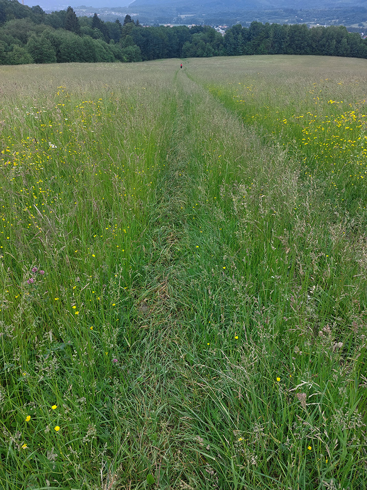 Na hrade sme zase do čohosi kusli, nech domov nenesieme, a rúbali sme priamo dole lesom, na lúky nad Podhradím. Stade už to bola Majova parketa, ale skoro celý záver už sme mali v panoráme – medzi dedinou v doline a malofatranským hrebeňom (v nepríjemne sivých mrakoch) na horizonte. Búrky hlásili až po jednej, ešte dve hodinky sme mali k dobru, tak vegeeeet. Akurát, že moje telo už trpelo aj z kopca. Ale aspoň som vedel prečo, nie ako vlani celé leto. Tak šmatľaním vpred, teda viac dole, do Podhradia. A furt poriadne strmo, auuu!