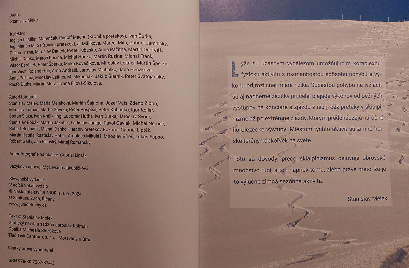 12. decembra 2024 sa v prednáškovej sále Štátnej vedeckej knižnice v Banskej Bystrici odohrala rozsahom malá, až komorná beseda, ktorej sa síce nezúčastnilo príliš veľa ľudí, ale tí podstatní tam zväčša boli. Debatovalo sa o novonarodenej knihe, ktorá je ale svojím obsahom aj rozsahom určite zásadná pre dokumentáciu histórie skialpinizmu na našom území. Perfektne nadväzuje na známe knihy Bohuša Štofana o horskom a extrémnom lyžovaní (a nielen na ne). Autor knihy Stanislav Melek - pamätník, organizátor pretekov, inštruktor, a najmä stále aktívny skialpinista, jej tvorbe venoval podľa vlastných slov s prestávkami viac ako 15 rokov. Pritom prvá myšlienka na takúto knihu mu vraj napadla približne pred 20 rokmi. Takže dielo je to poctivé a vyzreté, spracované dôstojne, pedantne a detailne vzhľadom ku svojmu poslaniu a určeniu. Aj graficky je kniha podarená: sivo-bielo-modrý dizajn sa skvelo hodí k téme, kde prevláda zima a sneh.