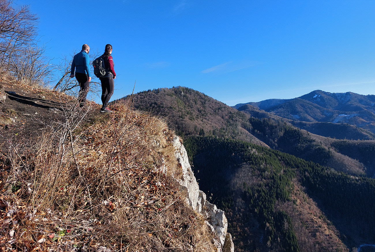 Vrcholové bralo najprudšie a teda s najširším výhľadom padá na juh, no pomedzi stromy je pekne vidieť aj Katovu skalu na západe, Krivánsku Fatru a samotné Podhradie hlboko dolu na severe a na východe aj tie Západné Tatry.