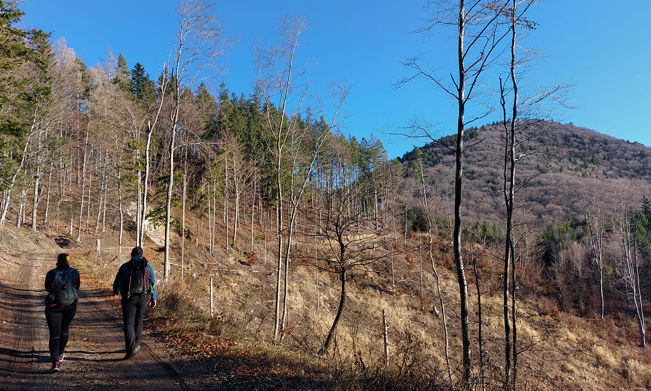 Po zostupe pokračuje jednoznačná a pohodlná zvážnica až na lúky s niekoľkými chatkami nad Podhradskou dolinou. Len záverečný „zjazd“ na dno doliny je poriadne prudký, aj keď široký. Čiže ak by toto (okrem oboch vrcholov samozrejme) išiel niekto na mtb, mal by sa držať nášho smeru, ak nechce tlačiť.