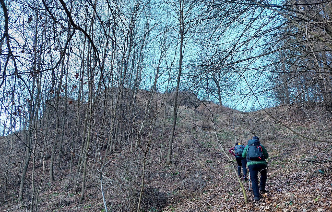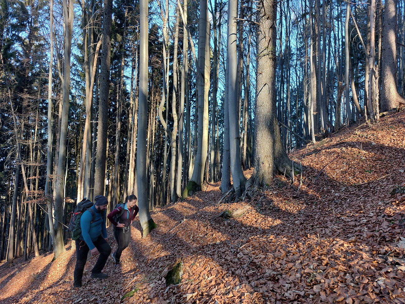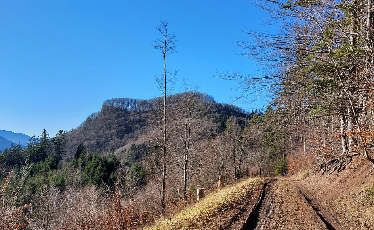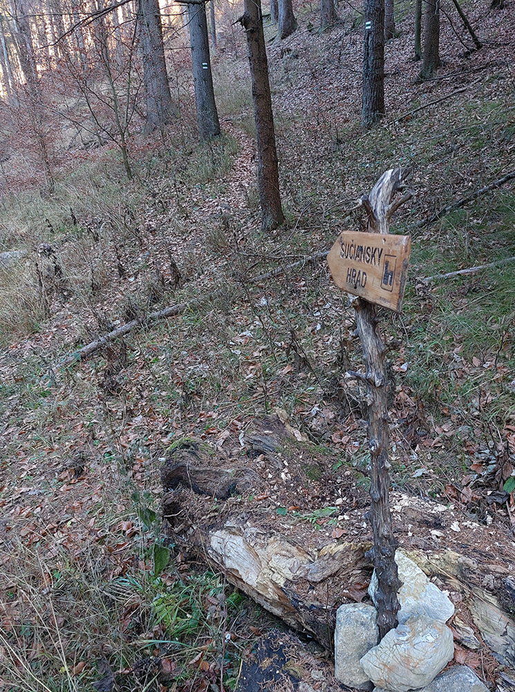 Dno podhradskej doliny je tradične rozjazdené traktormi, tak sme to švihli hore na hrad, a to už bola príjemná prechádzka na záver. Väčšinou lesné chodníky a šuchot lístia pod nohami. Aj vynorenie do panorámy nad dedinou cestou dole z hradu, s protiľahlou Krivánskou Fatrou, krásne nasvietenou: