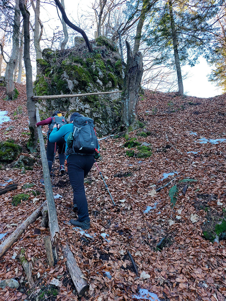 Návrat kúsok po červenej na križovatku zvážnic a z nej pevnou cestou priamo pod Prieložnicu, na lúku so soliskom, kde sa nenápadne odpája chodník na vrchol. Ten je pekne strmý, hore ešte okorenený bralkami, cez ktoré sa treba vyštverať na samý vrchol. Ale aj kus provizórneho zábradlia tam je, v najstrmšom.