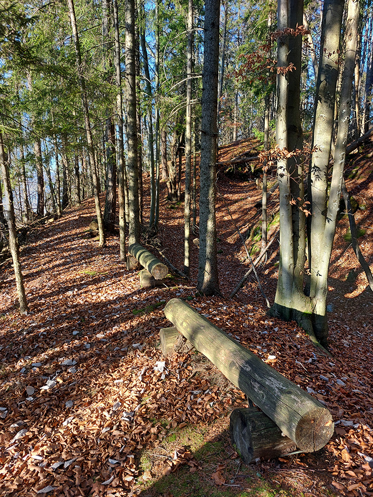 Takže najskôr dolinou potoka Máleník na Katovu skalu: mierne stúpanie, lesná cesta popri niekoľkých rybníkoch a chatách, čím vyššie, tým viac rúbaní, blata a makadamu. Strmší záver po bukovom lístí a zo skaly parádne výhľady ponad Sklabinský hrad do kotliny, až ku Kľaku malofatranskému. Za chrbtom zas ten veľkofatranský, Prieložnica hneď pred ním: